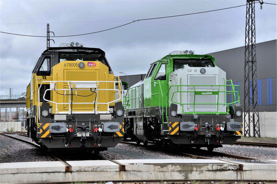 d'une nouvelle BB 79000 de SNCF RESEAU et d'une nouvelle DE 18 en livrée Vossloh en provenance de l'usine de Vossloh à Kiel en Allemagne