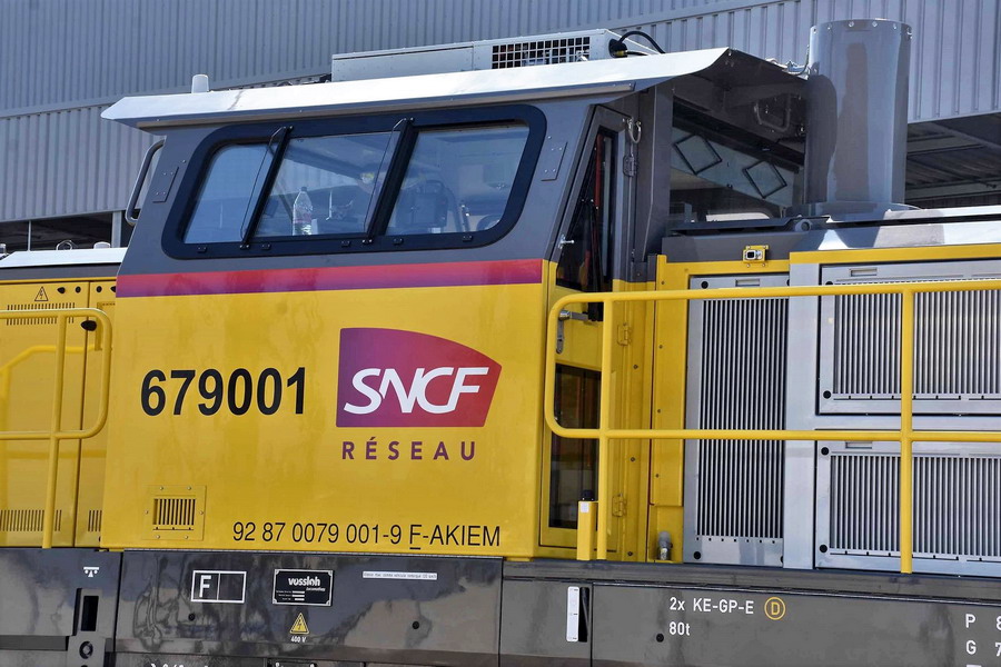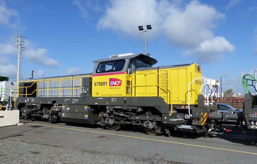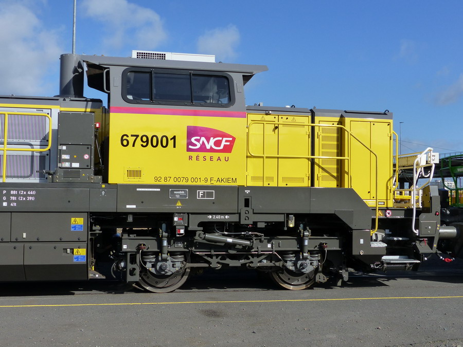 Nous pouvons voir le double marquage sur la cabine avec l'EVN n°92 87 0079 001-9 F-AKIEM et 679001 pour SNCF RESEAU