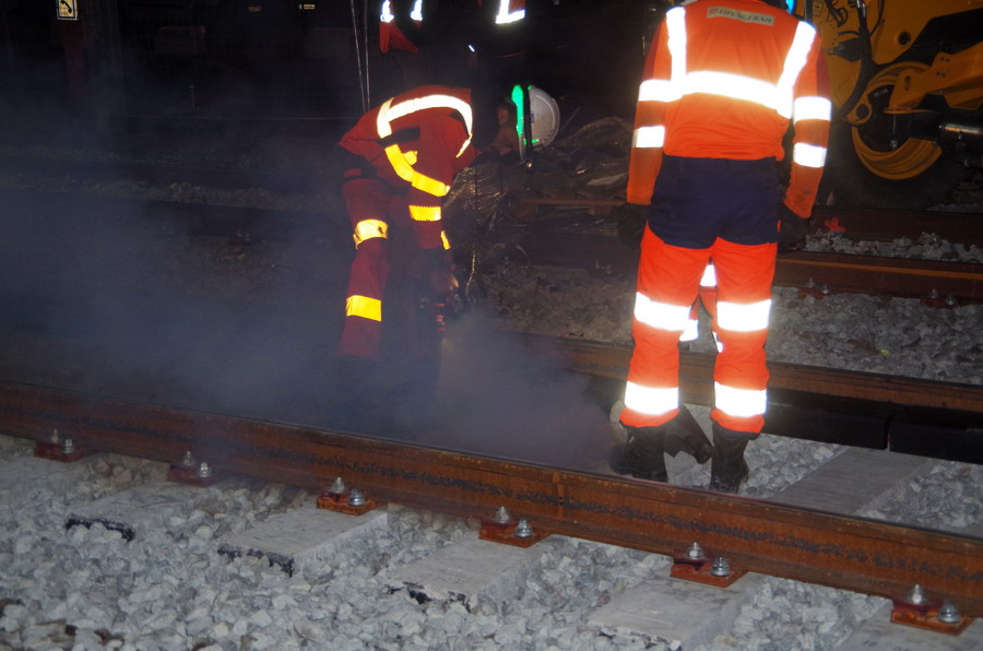 montage des tiges de fixation de la première dalle STRAIL pour le PN 58 à Chauny nuit du 29 au 30-04-2019
