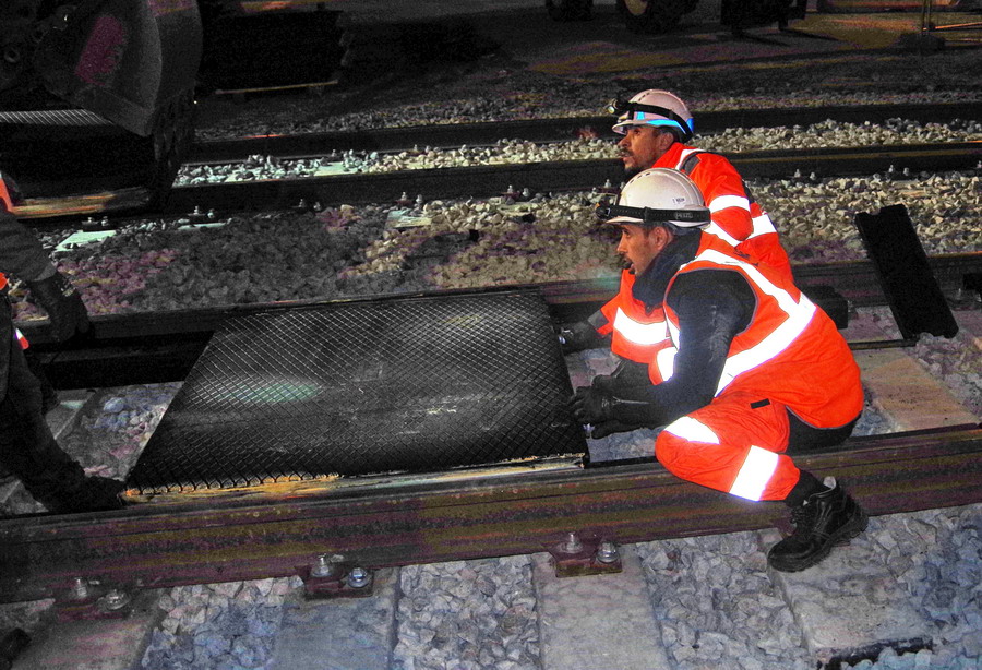 montage des tiges de fixation de la première dalle STRAIL pour le PN 58 à Chauny nuit du 29 au 30-04-2019