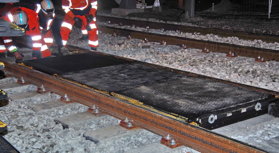 à Chauny (02) aprés la mise en place des dalles STRAIl entre les rails dans la nuit du 29 au 30 avril.