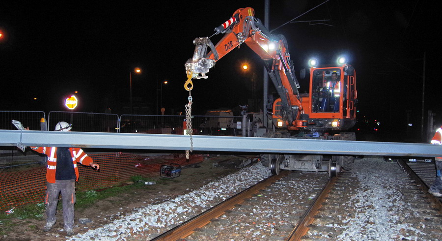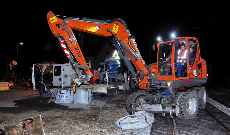 mise en place d'un poteau de caténaire avec la Pelle D2R Z110 PRR n°WNCE0606LPAL00303 au PN 58 à Chauny nuit