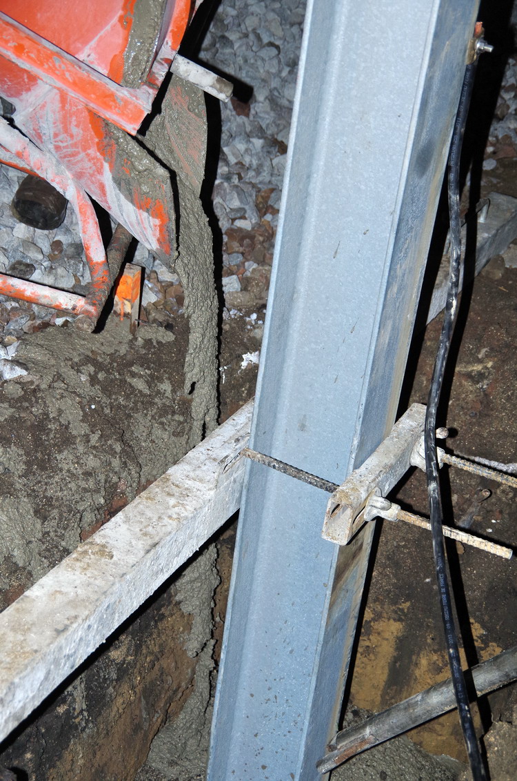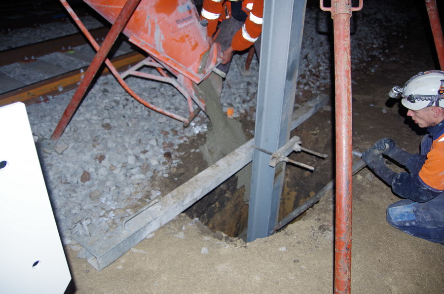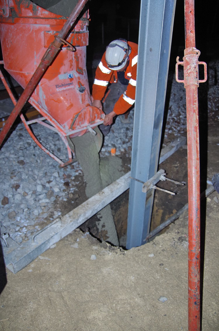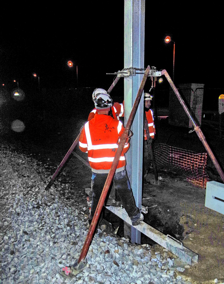 fixation du poteau de caténaire dans un trou de mâtage pour le coulage du béton prêt à l'emploi au PN 58 à Chauny nuit