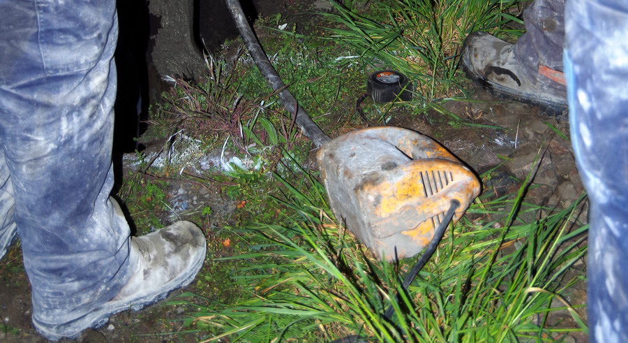 déchargement des sac du béton prêt à l'emploi de Cantillana pour les trous de mâtage au PN 58 à Chauny nuit