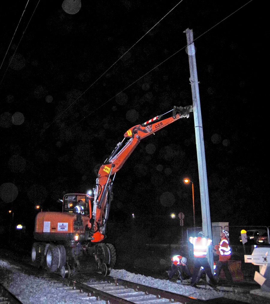 mise en place d'un poteau de caténaire avec la Pelle D2R Z110 PRR n°WNCE0606LPAL00303 au PN 58 à Chauny nuit