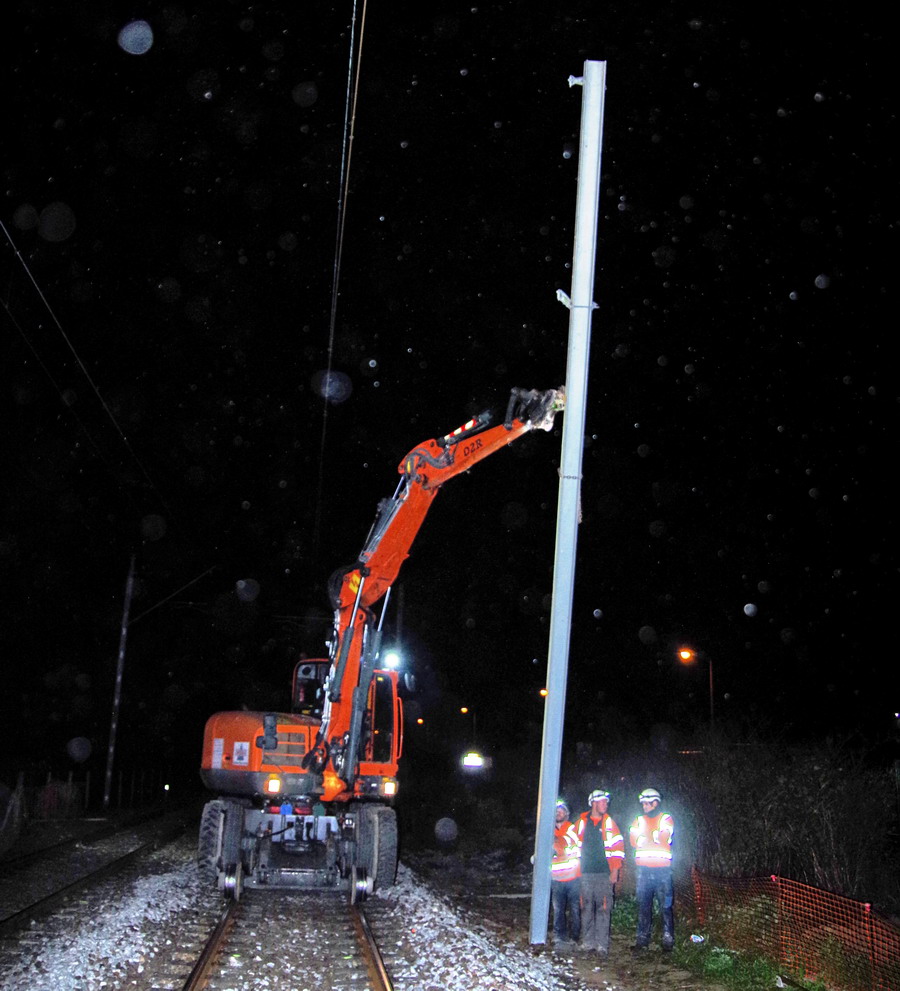 mise en place d'un poteau de caténaire dans un trou de mâtage avec la Pelle D2R Z110 PRR n°WNCE0606LPAL00303 au