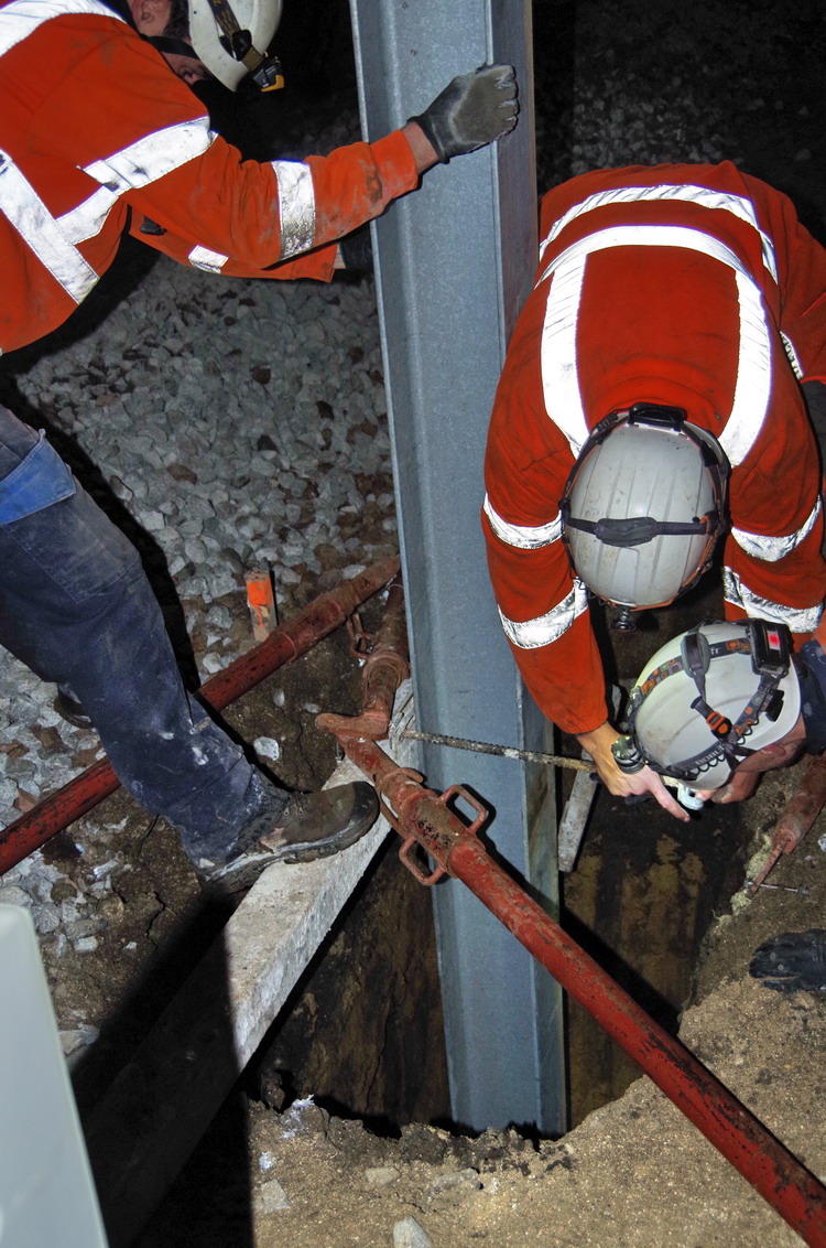 fixation du poteau de caténaire dans un trou de mâtage pour le coulage du béton prêt à l'emploi au PN 58 à Chauny nuit