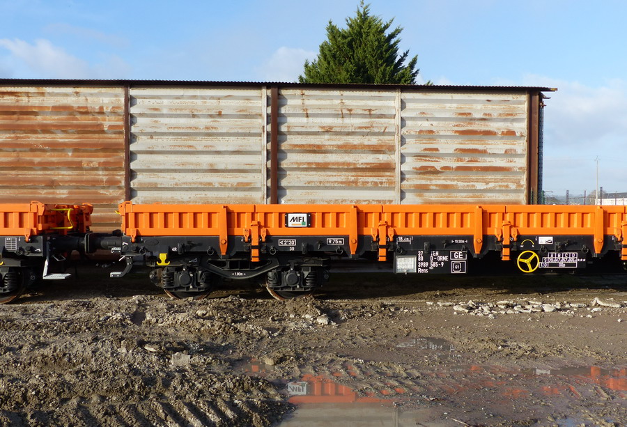 Voici le wagon 37 80 3989 585-9 Rens 192 C - TEN RIV D-ORME de la société On Rail Gmbh (Allemagne) pour la société de location de wagons M.F.I sa (Matériel Ferroviaire et Industriel) de Strasbourg qui est une société spécialisée dans l'achat-vente, la location,