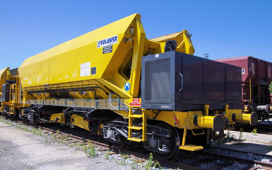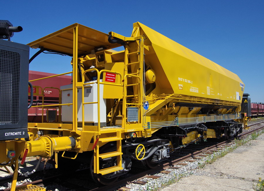 avec deux trémies et possibilité de ballastage, et aussi pour récupérer l'ancien ballast et qui le vide avec les bandes transporteuses