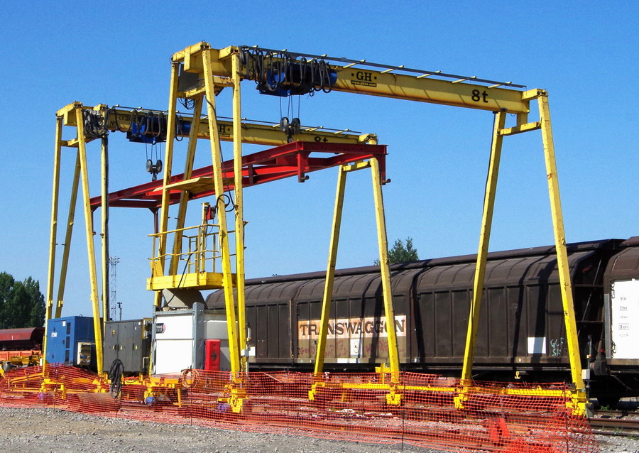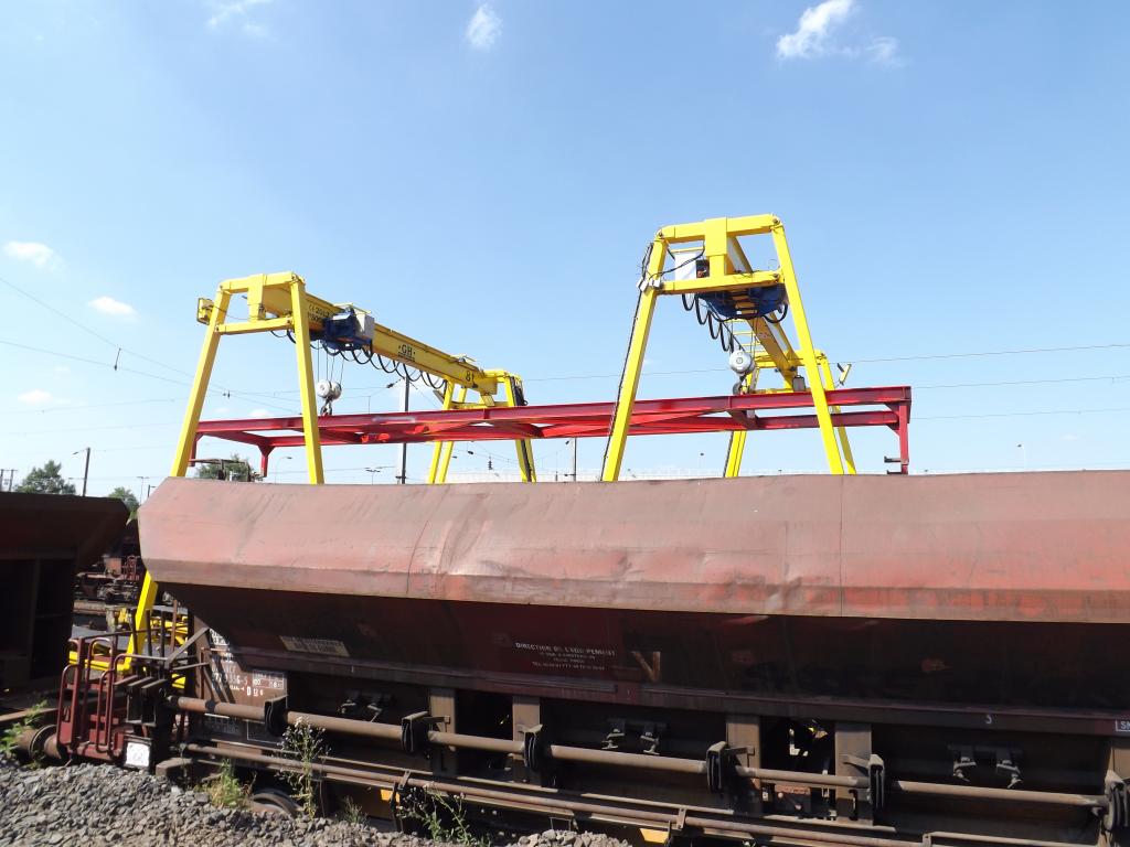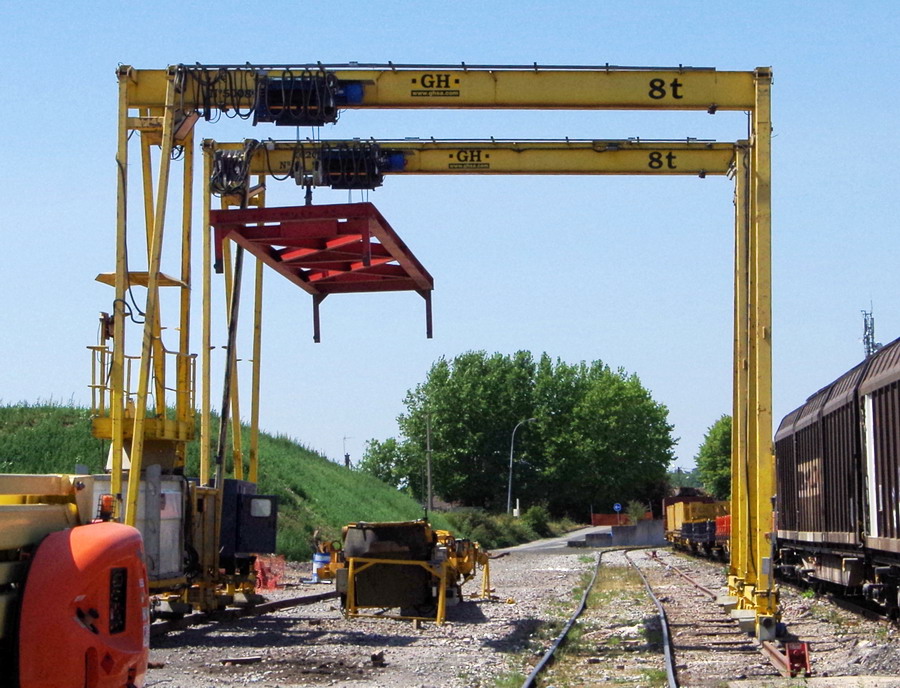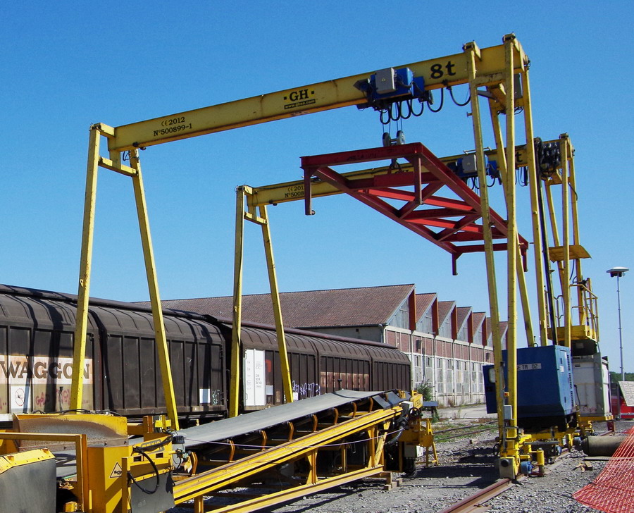 Portique GH 8T n°5008899-1 et 5008xxx-x de 2012 pour la mantention des tapies roulant WAC sur les wagons Tombereaux