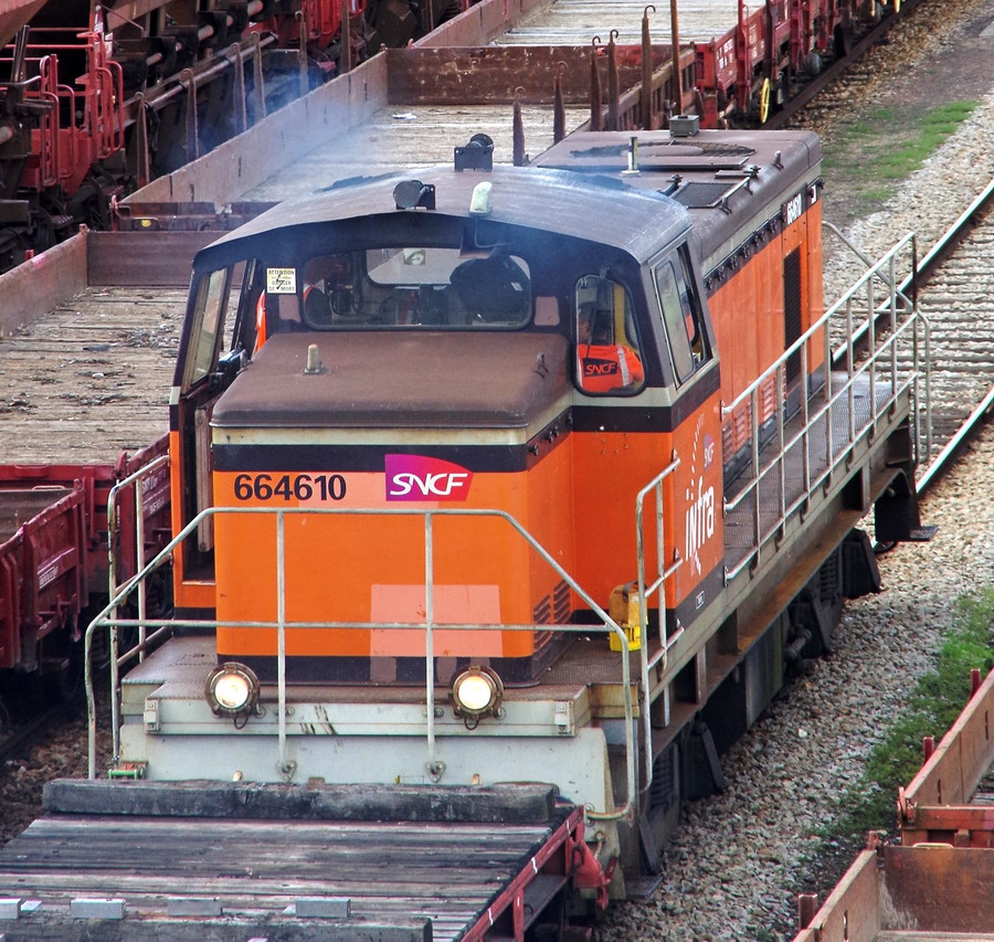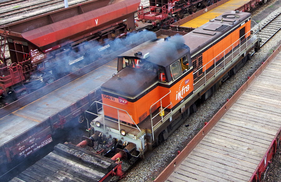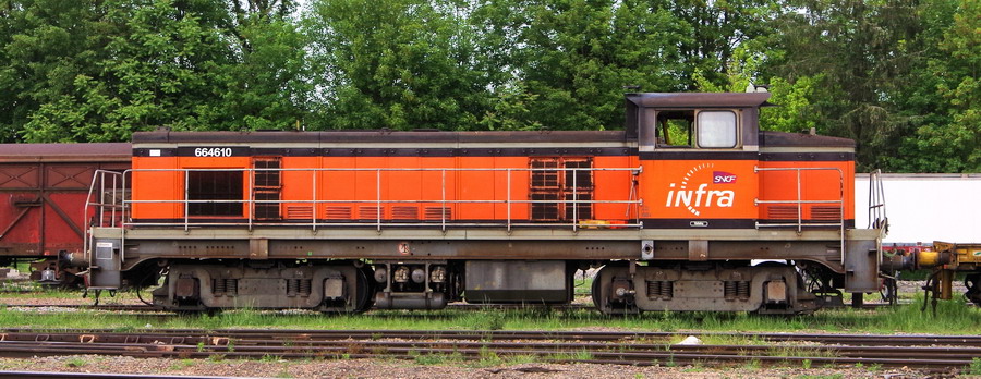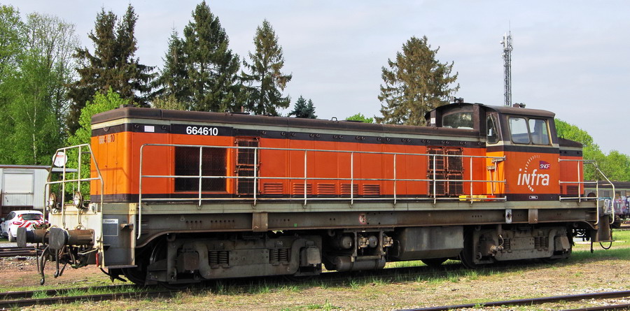 Voici la 6 64610 Infra ex 63698 mise en service le 23-04-1954 en livrée Arzens avec le logo Infra