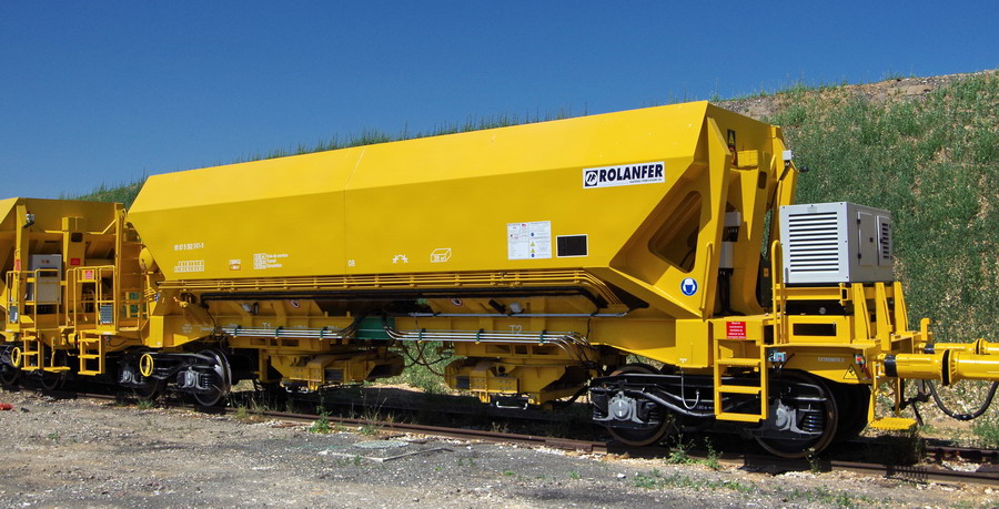 avec deux trémies et possibilité de ballastage, et aussi pour récupérer l'ancien ballast et qui le vide avec les bandes transporteuses
