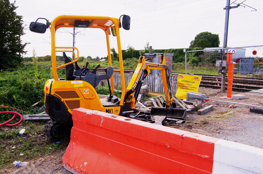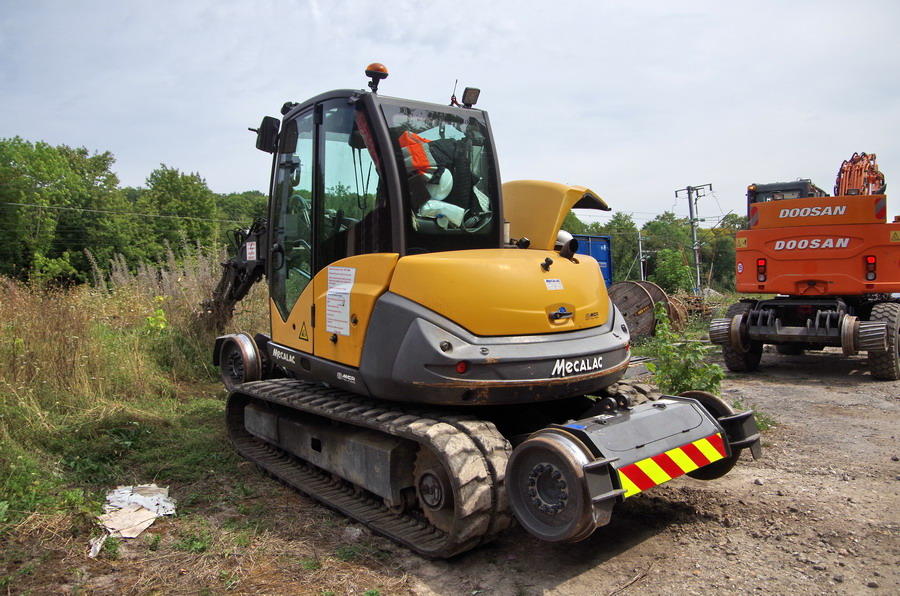 Présence de la Pelle RR Mecalac 8 MCR n°MEC08MCRKF0135018 Delcourt Rail en gare de Poix de Picardie le 27-08-2019
