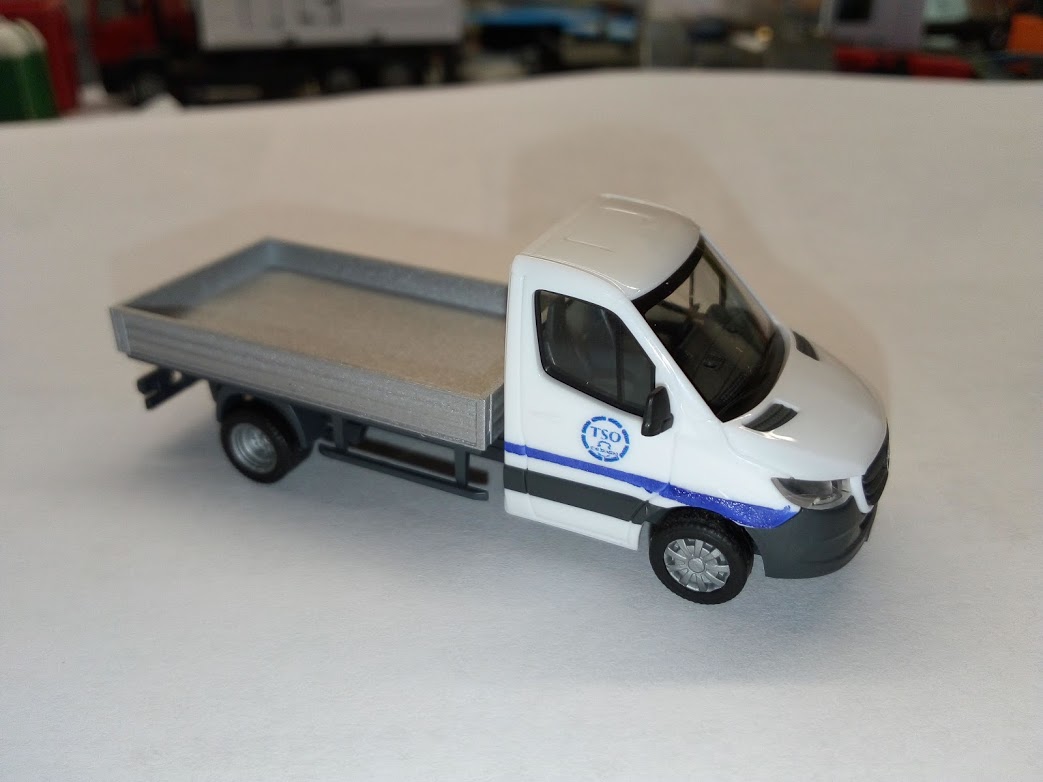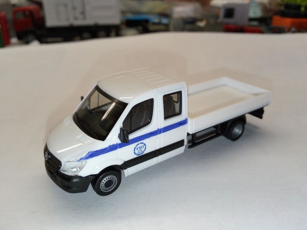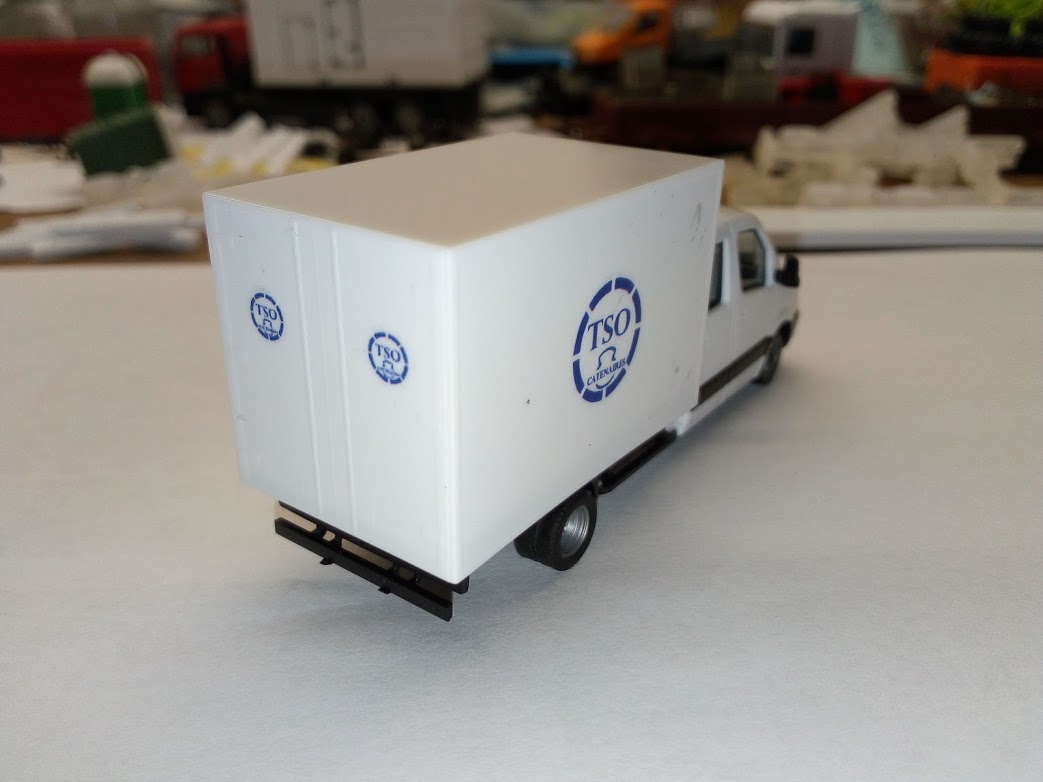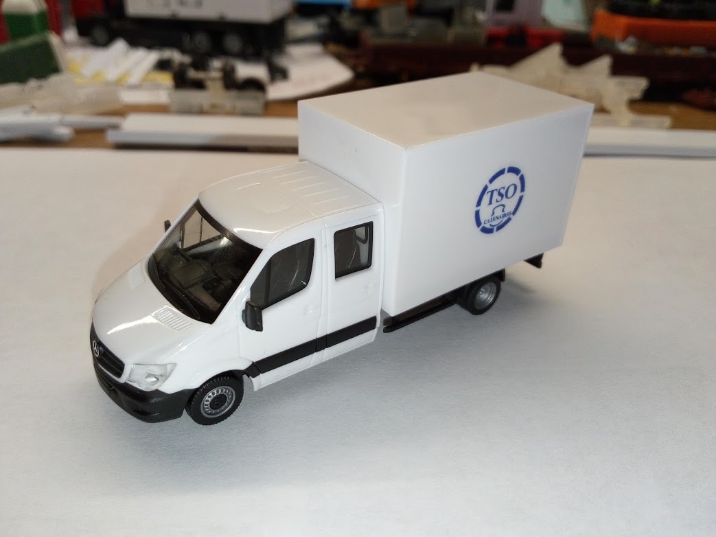 arrivée aujourd'hui transformé aujourd'hui, le fourgon double cabine (Sprinter) qui devait être un master (non reproduit en ho) pour l'entreprise TSO caténaire