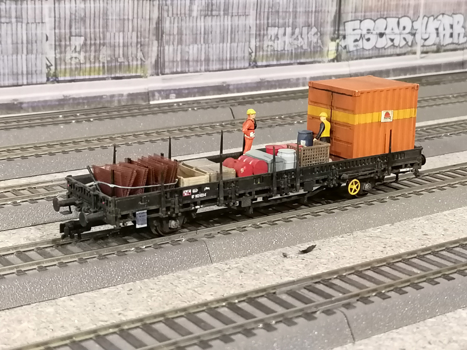 Le wagon plat est un Ks ou K50 de chez Roco. Matériel très fragile. Il est entièrement repeint avant patine et pose des plaques, marche-pieds, ... . Le plancher est d'ABE. Les décalques Tchoutchou et CJ'Models. Container recyclé. Le chargement vient d'origines diverses.