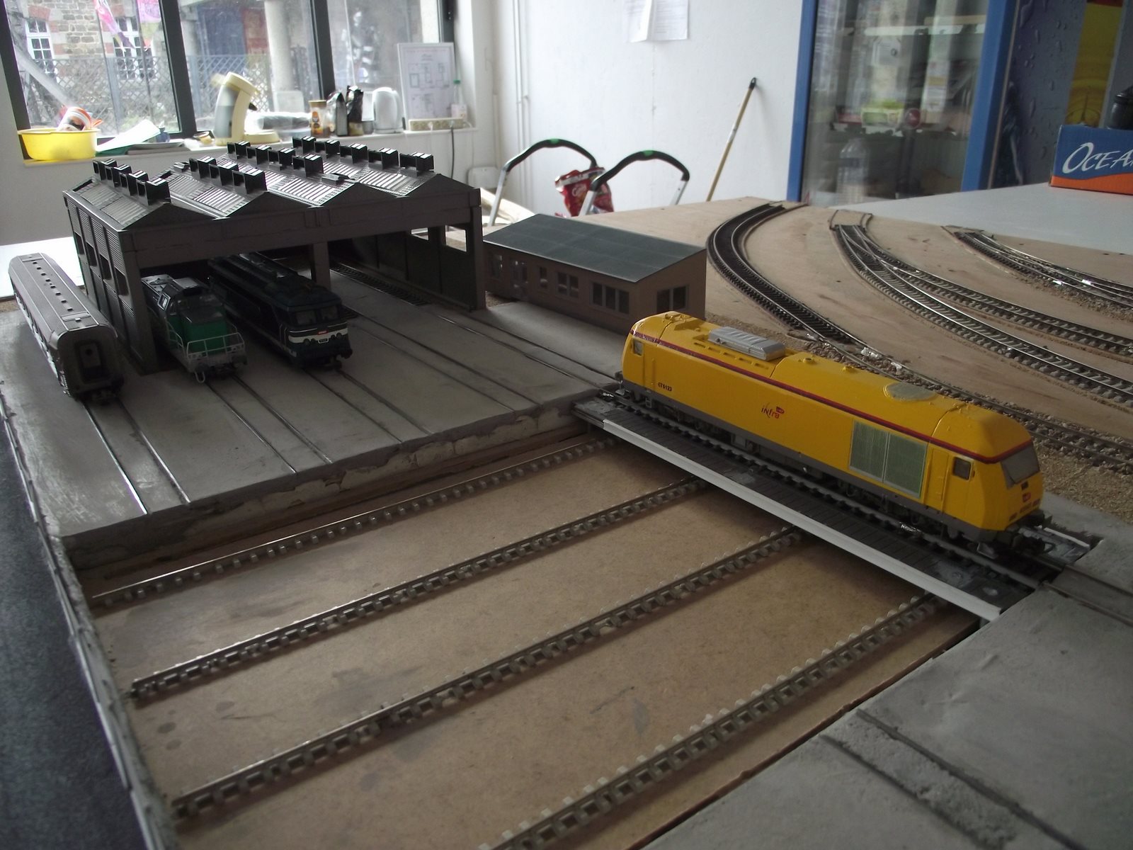 Après un long moment sans rien avancer, j'ai repris le montage du réseau. Décors de la partie "cour marchandise", motorisation du pont transbordeur,