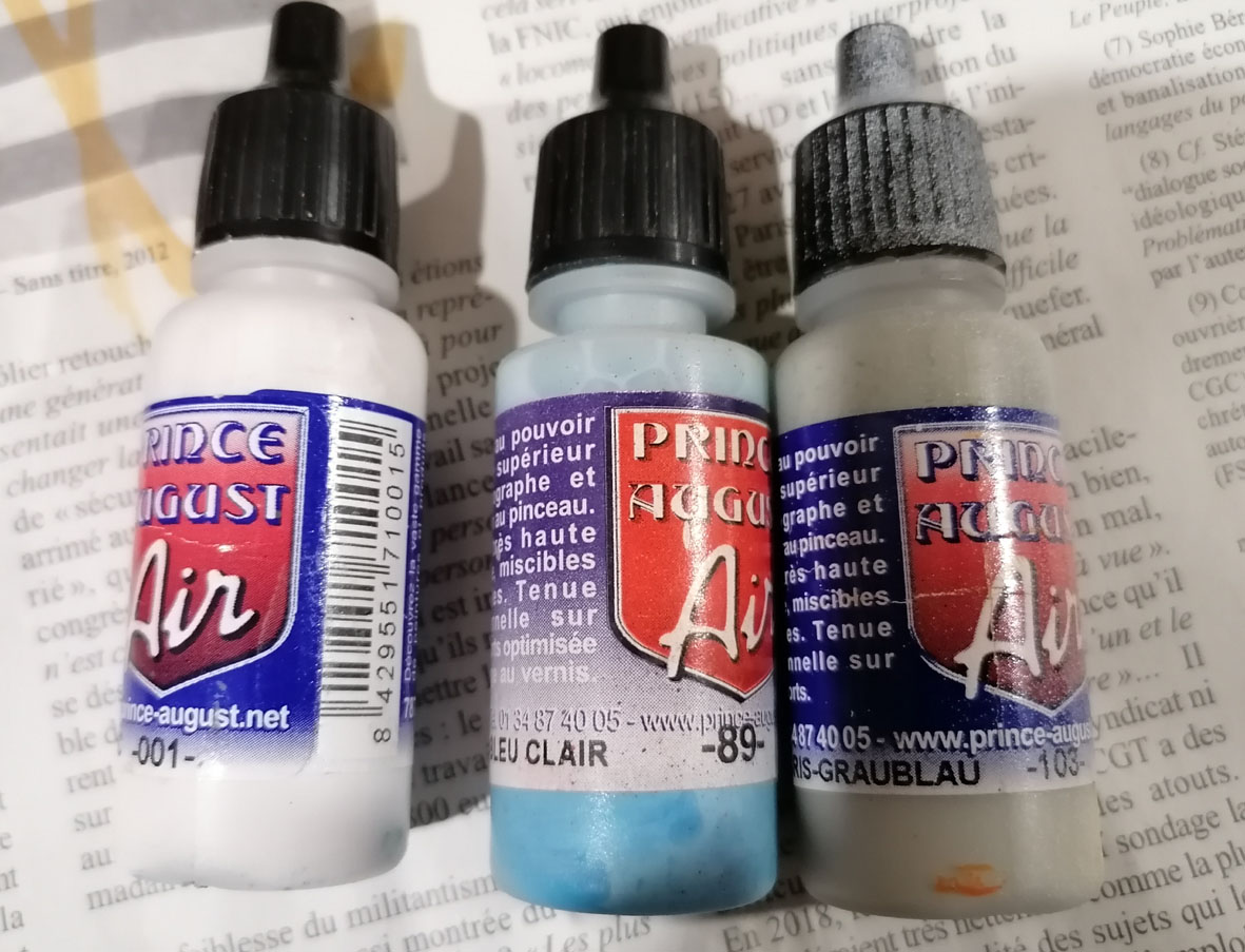Je fais les mélanges sur un bout de plastique et directement dans le godet de l'aéro. Quand après séchage c'est pas, ça il m'arrive de tout recommencer.