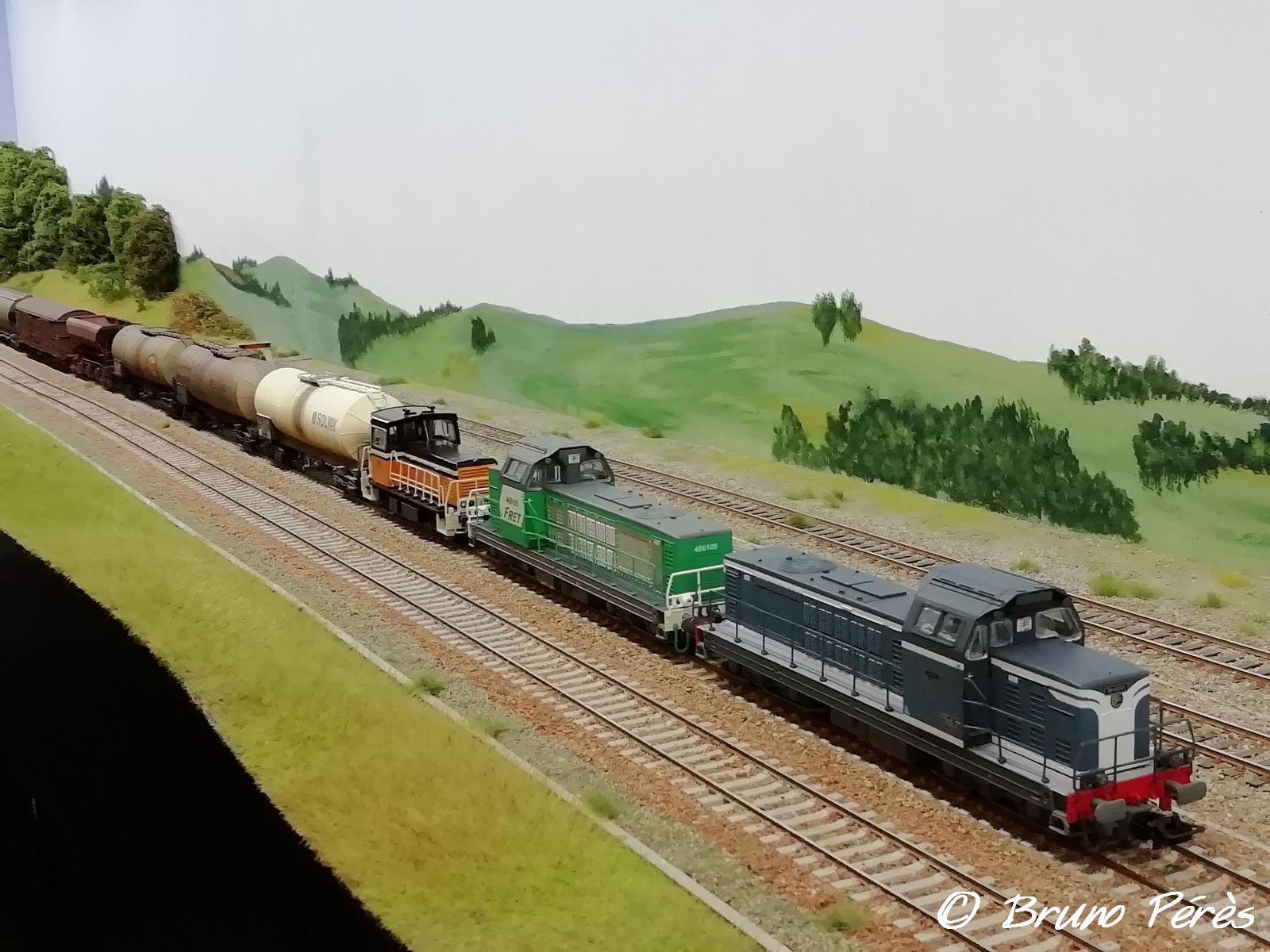 Mise en situation avec un train de ballast neuf tracté par une UM de BB 67400, la jaune Infra en véhicule (compositions type ici et là)