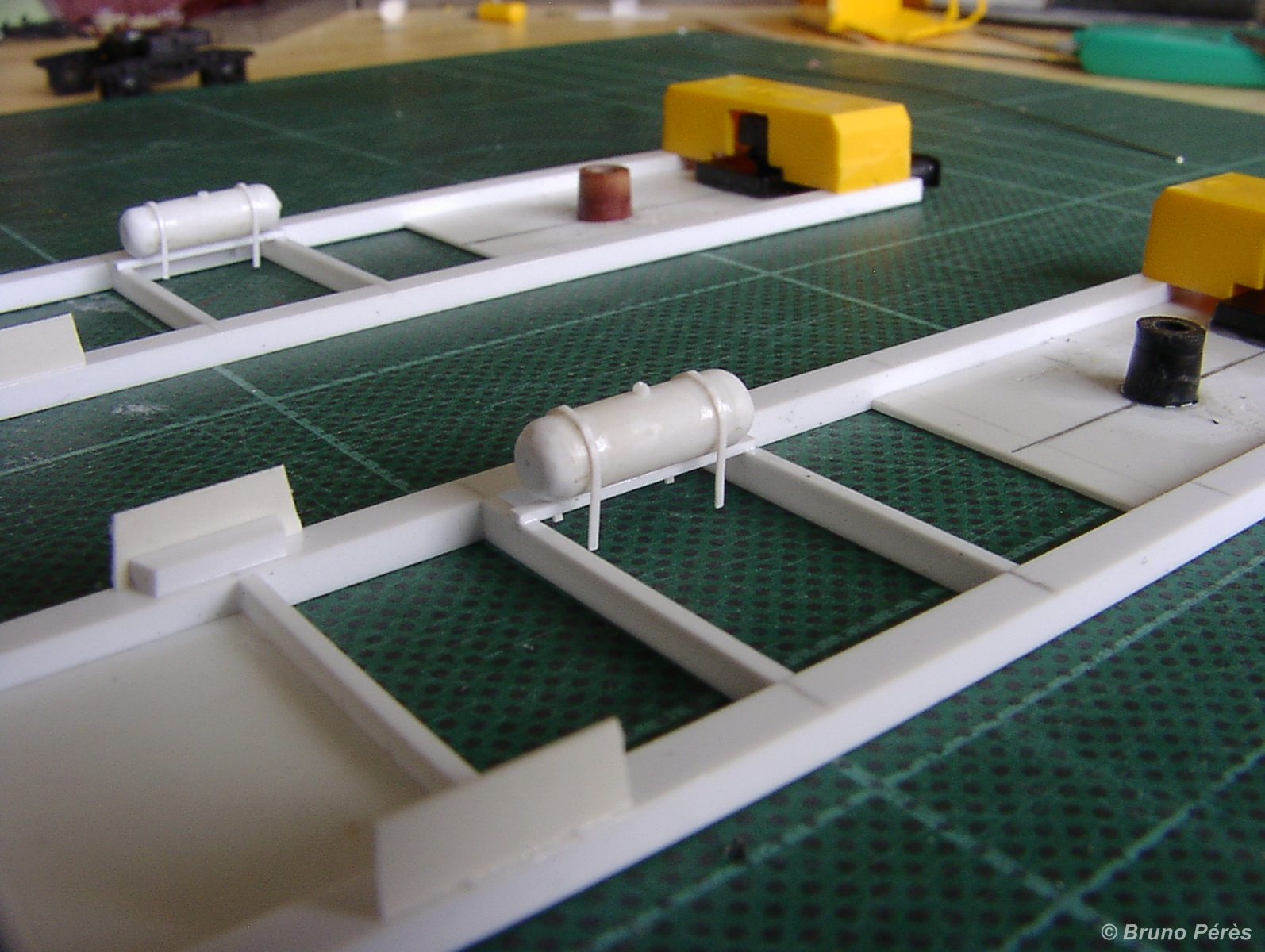 - contrairement à ce qui est dit dans l'article, les traverses Kibri sectionnées et poncées au ras des embases de tampons ne sont pas suffisamment longues. Il manque 1/2mm. Prévoir donc un poil plus long !