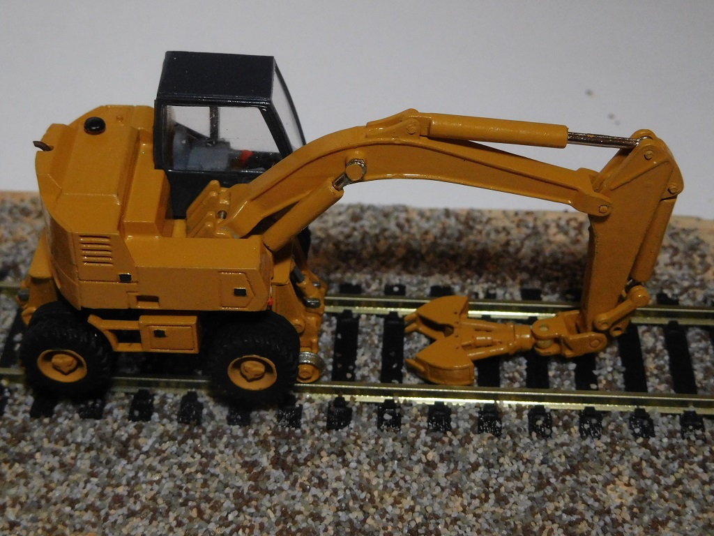 Il s'agit d'une pelle rail-route de la marque CASE-POCLAIN modèle 588 PRR avec sa benne preneuse ARDEN EQUIPEMENT BA 402, le tout à l'échelle HO :
