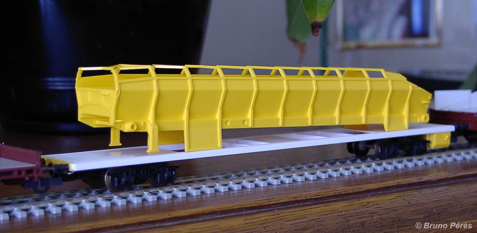 Voici quelques photos pour vous montrer l'avancée des travaux. Dans les deux photos suivantes, la trémie a été raccourcie et les deux parties la constituant collées entre elles (la trémie est livrée en deux partie, mais est trop longue de deux segments). Elle est simplement posée sur le châssis, lui-même posé sur deux très vieux boggies Y25 Jouef, ce qui explique l'impression que le 1er est à côté des voies. Mais que neni :!: