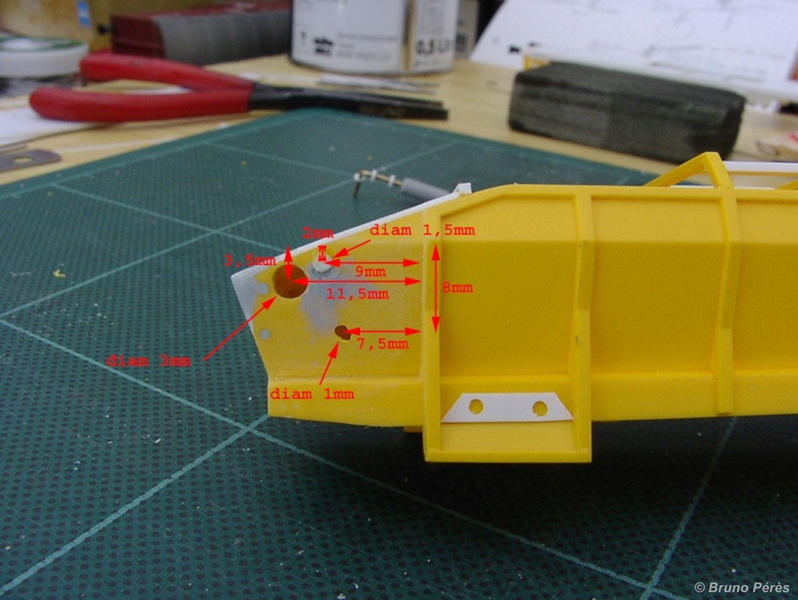 Uniquement de ce côté, percez trois trous de 3 - 1,5 et 1mm selon les cotes ci-dessous. Celui de 3mm sera obturé par une grille, celui de 1,5mm par un profilé EVG rond 222 affleurant sur sa partie haute, et celui de 1mm par le futur pot d'échappement.