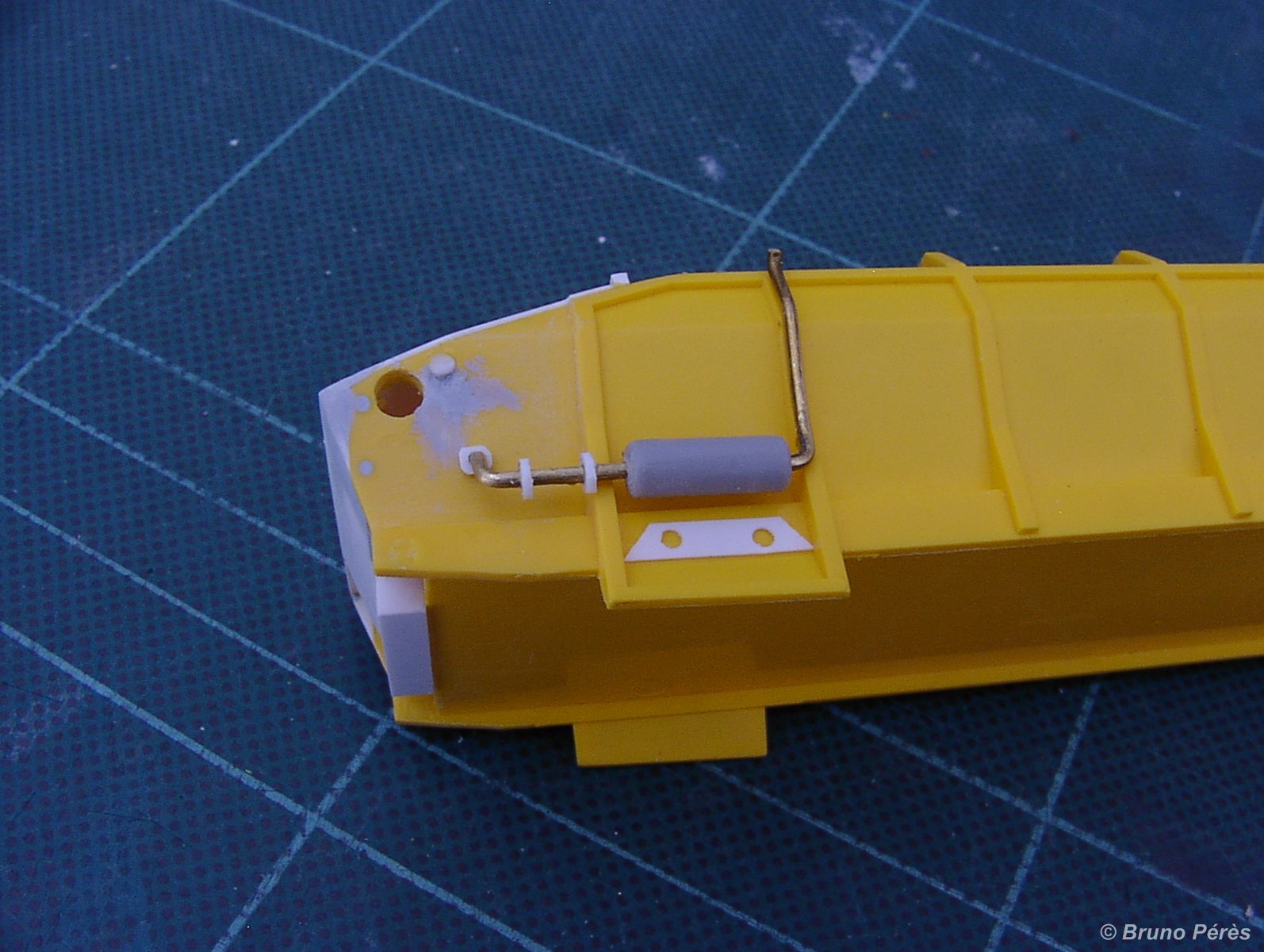 Avant de travailler sur les pièces à ajouter pour réaliser le groupe énergie, il faut impérativement percer la trémie à plusieurs endroits et mettre en forme l'extrémité de la trémie par ponçage et ajout de pièces en plasticarte (la photo macro est impardonnable avec les imperfections, et même si certaines seront totalement cachées à terme, ça fait désordre :oops: :oops: :oops: ).