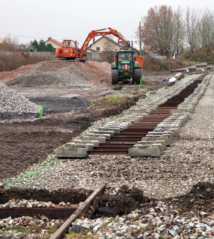 mise en place des nouvelles traverses bibloc neuves sur le site en travaux de Longueau le 26-11-2018