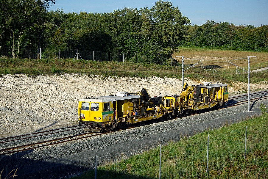 sous un des des 2 wagons se trouve un groupe de stabilisation qui fait vibré des rail pour que le ballast se mette en place et ne bouge plus