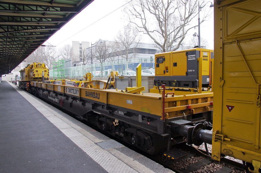 D-RTS 99 80 9320 011-6 - wagon porte agrès et poutre de levage en gare de Paris Est voie n°30 le 21 mars 2015