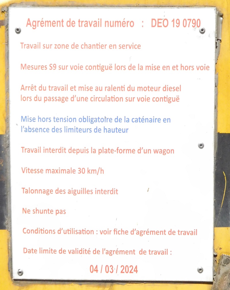 En voici l'agrément SNCF. Malheureusement je n'ai pas réussi à trouver la plaque constructeur bien qu'elle soit censée se trouver sur la cabine... Heureusement l'affichette permets d'avoir au moins le numéro de série.