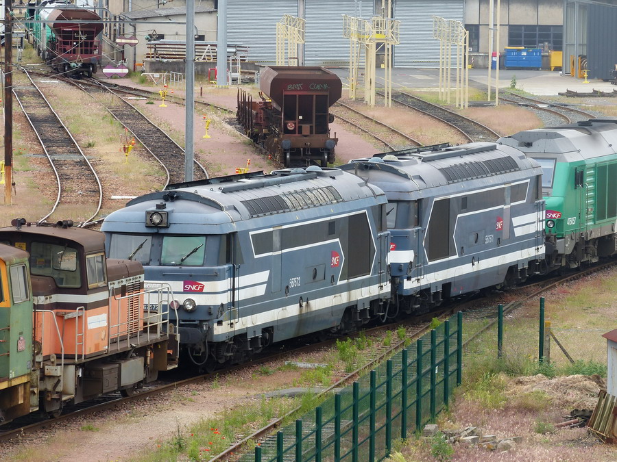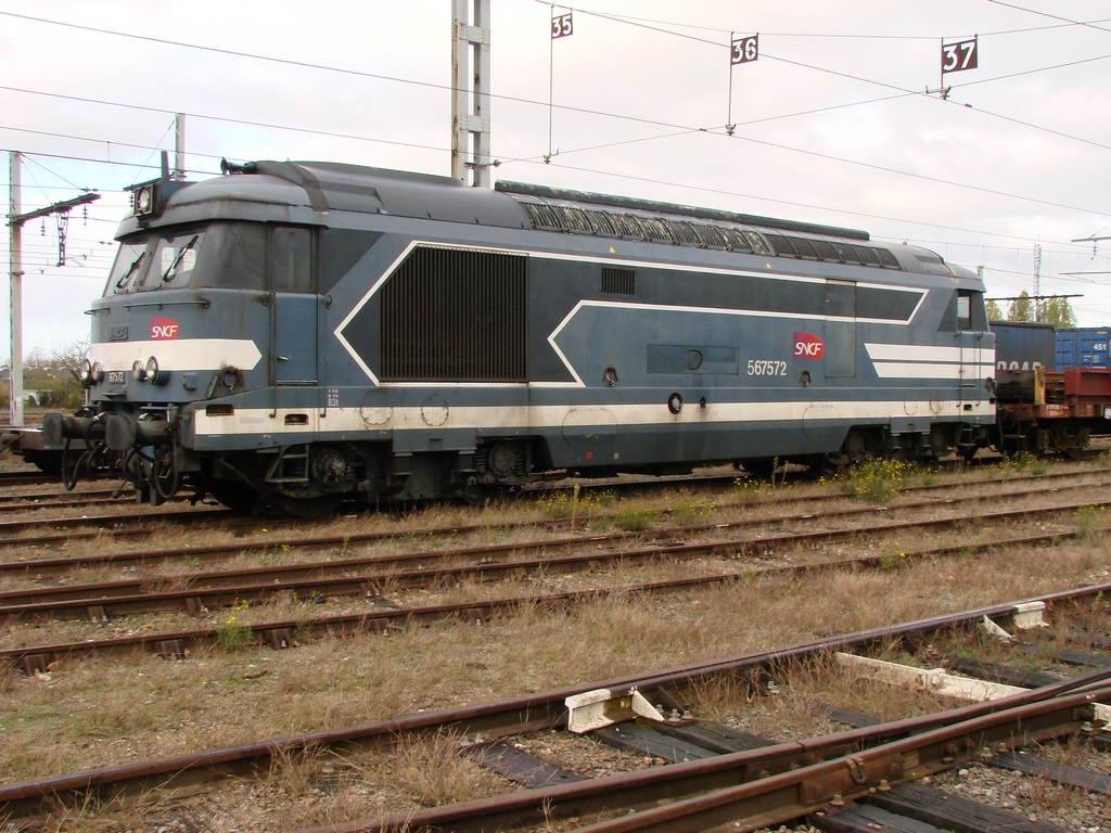 J'ai surpris cette 567572 encore très présentable sur une rame de wagons porte-rails stationnée dans le faisceau de Bitray, ancien triage de la gare de Châteauroux (Indre), le 9 novembre 2016 :