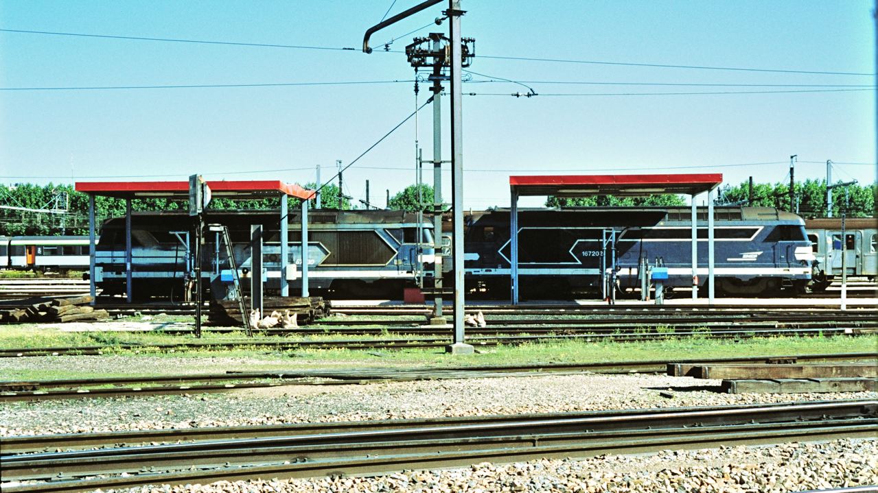 Voici la 667202 Infra dans la fumée d'échappement de son moteur et le soleil à la sortie Nord du dépôt de Saint Pierre des Corps