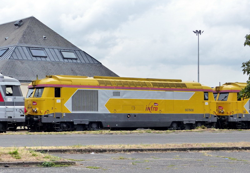 La voici dans le dépôt de Saint Pierre des corps le dimanche 09-08-2015 entre deux autres machines Infra avec la