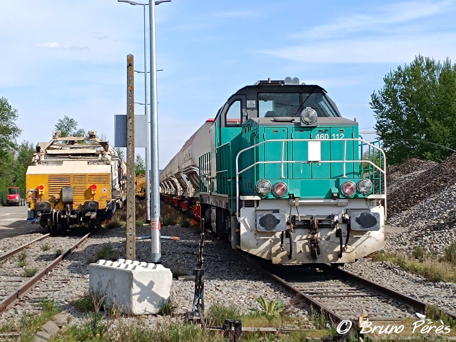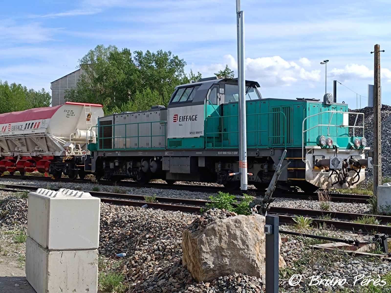 Voici la BB 60112 d'Eiffage vue le 09/04/2025 à St Jory (31) en tête d'une rame de trémie EX de l'entreprise. J'ignore sur quel chantier ce matériel était engagé