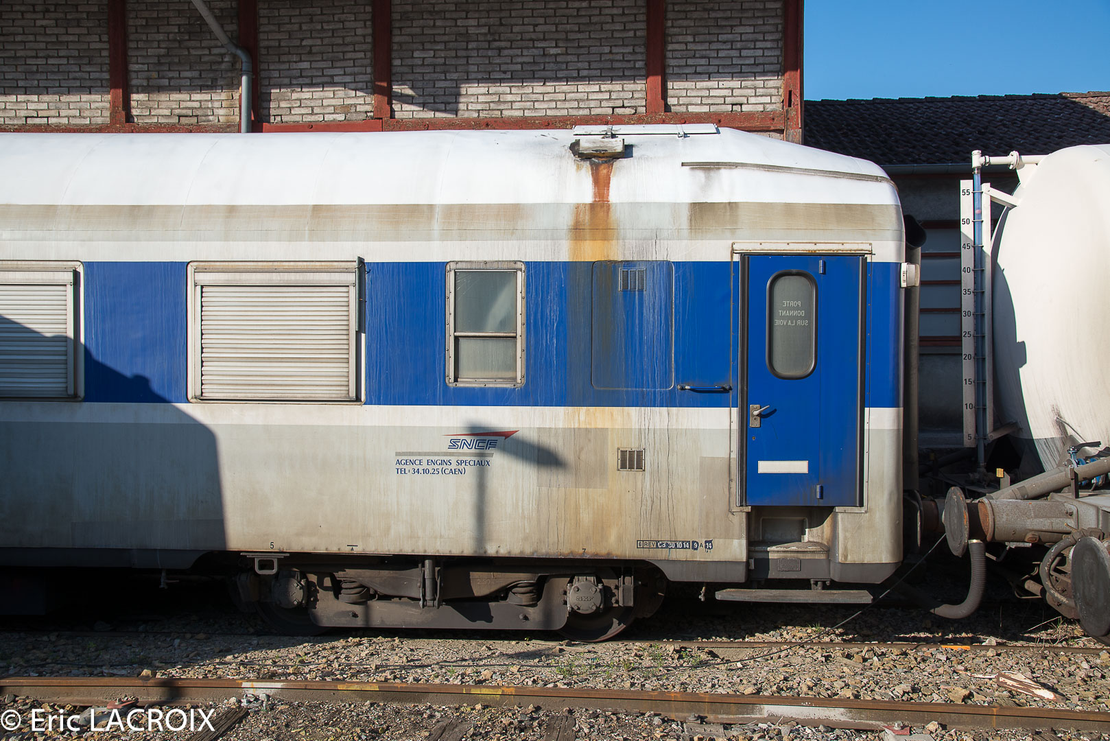 voici la voiture de cantonnement du train désherbeur vu au pied du PRS de Culoz sur une voie du faisceaux équipement