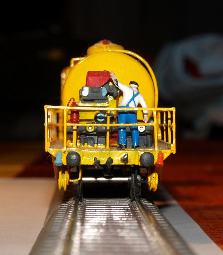 Le wagon était attelé en permanence à la draisine pour l'alimentation des feux rouges. En effet, je craignais que la proximité de vapeur d'essence F et du possible étincelage des capteur de courant ne fasse pas bon ménage et ne mette le feux sur le réseau.