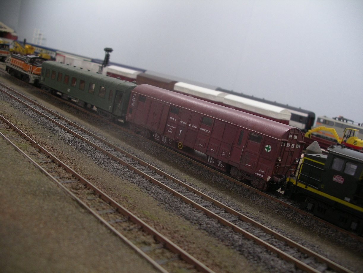 le wagon de secours de grande intervention, transformation du wagon bétailler Jouef, et la voiture de cantonnement