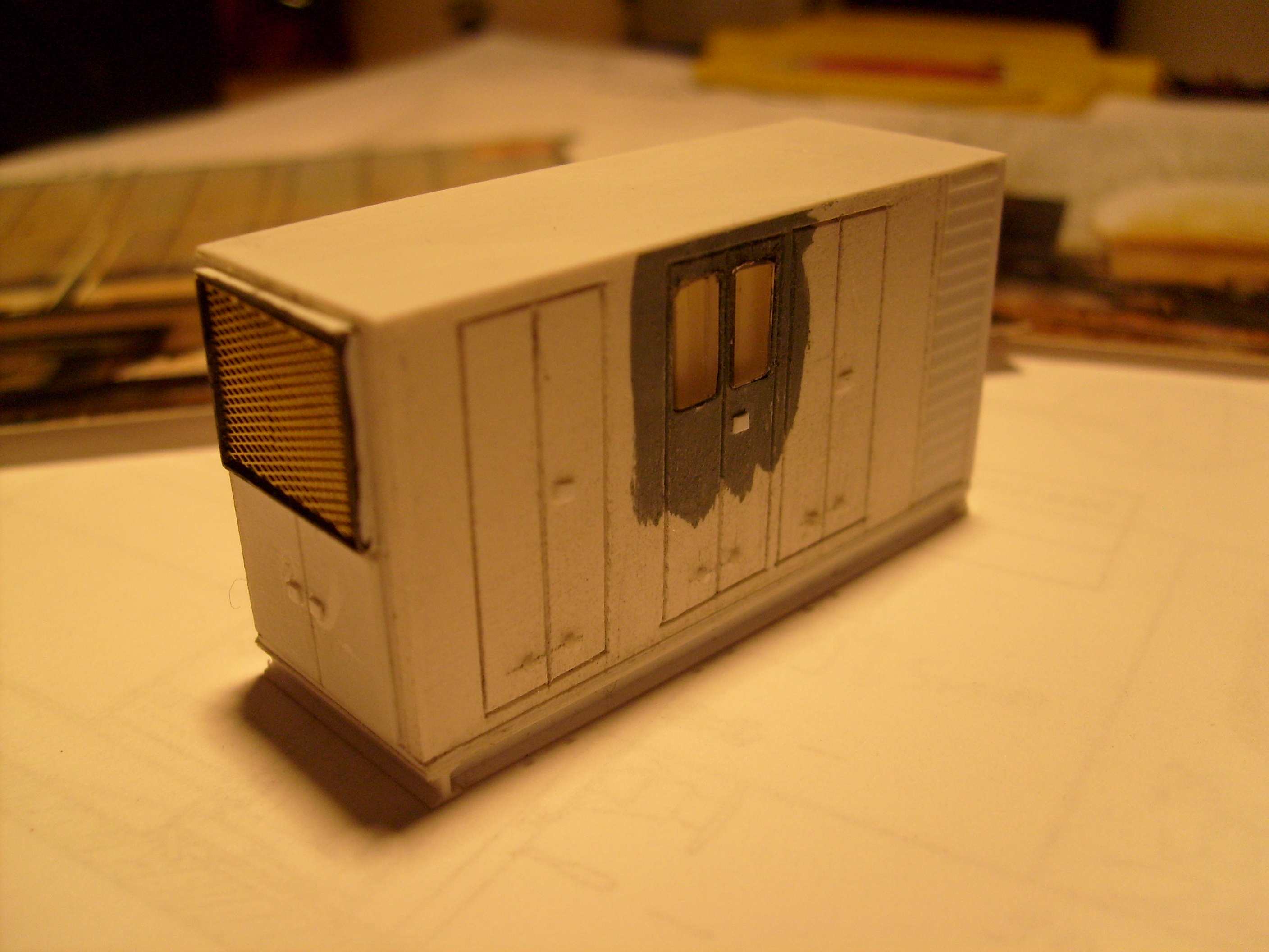 Ton compresseur doit être moins large que celui d'Arnaud (et le mien) parce que question place pour installer les tubes, c'est restreint.Quant au compresseur, le mien est très proche du tien: gravures pour simuler les portes, charnières en EVG, grille fine Haxo...j'hésite quant aux marchepieds (pourquoi pas des SMD).Voilà.