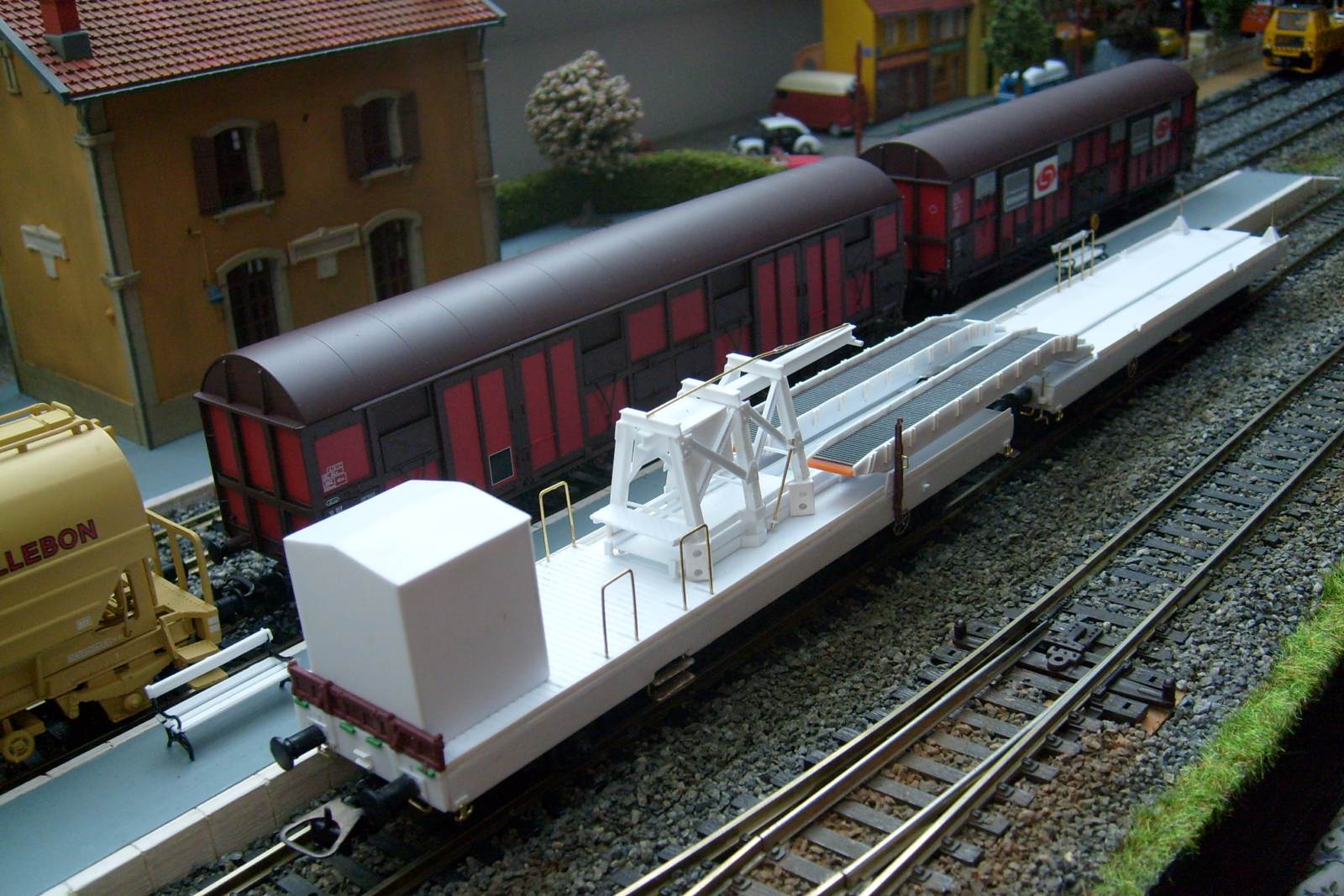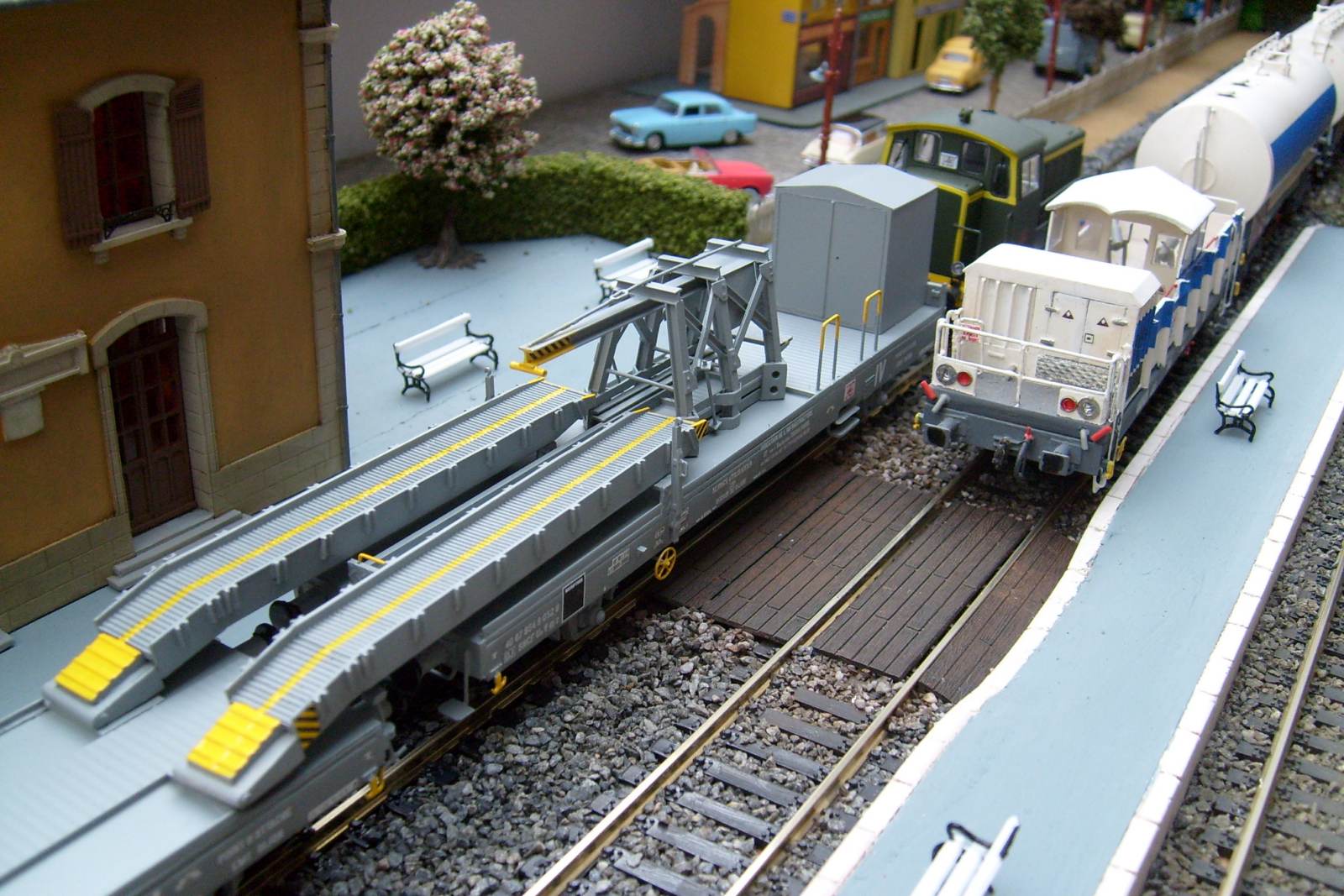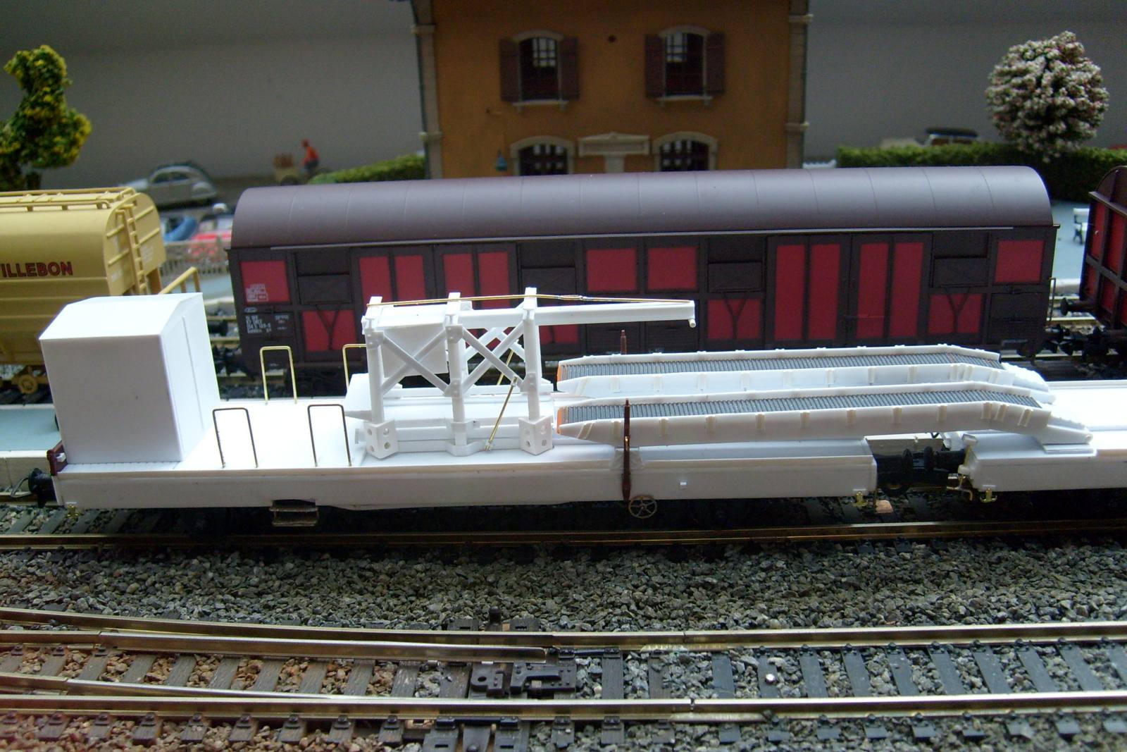 Les châssis sont faits maison et non des modèles du commerce comme je le pensais (le couplage est construit sur base de deux K50 en réalité), et les surfaces de roulement de la rampe d'accès sont tirées de persiennes de TGV Lima recyclé !