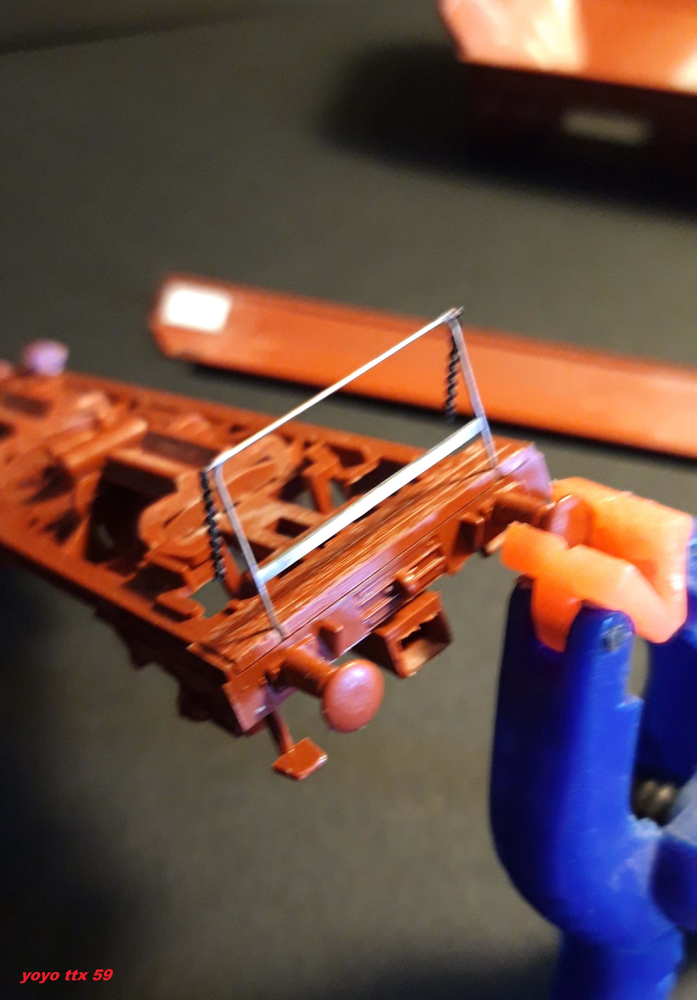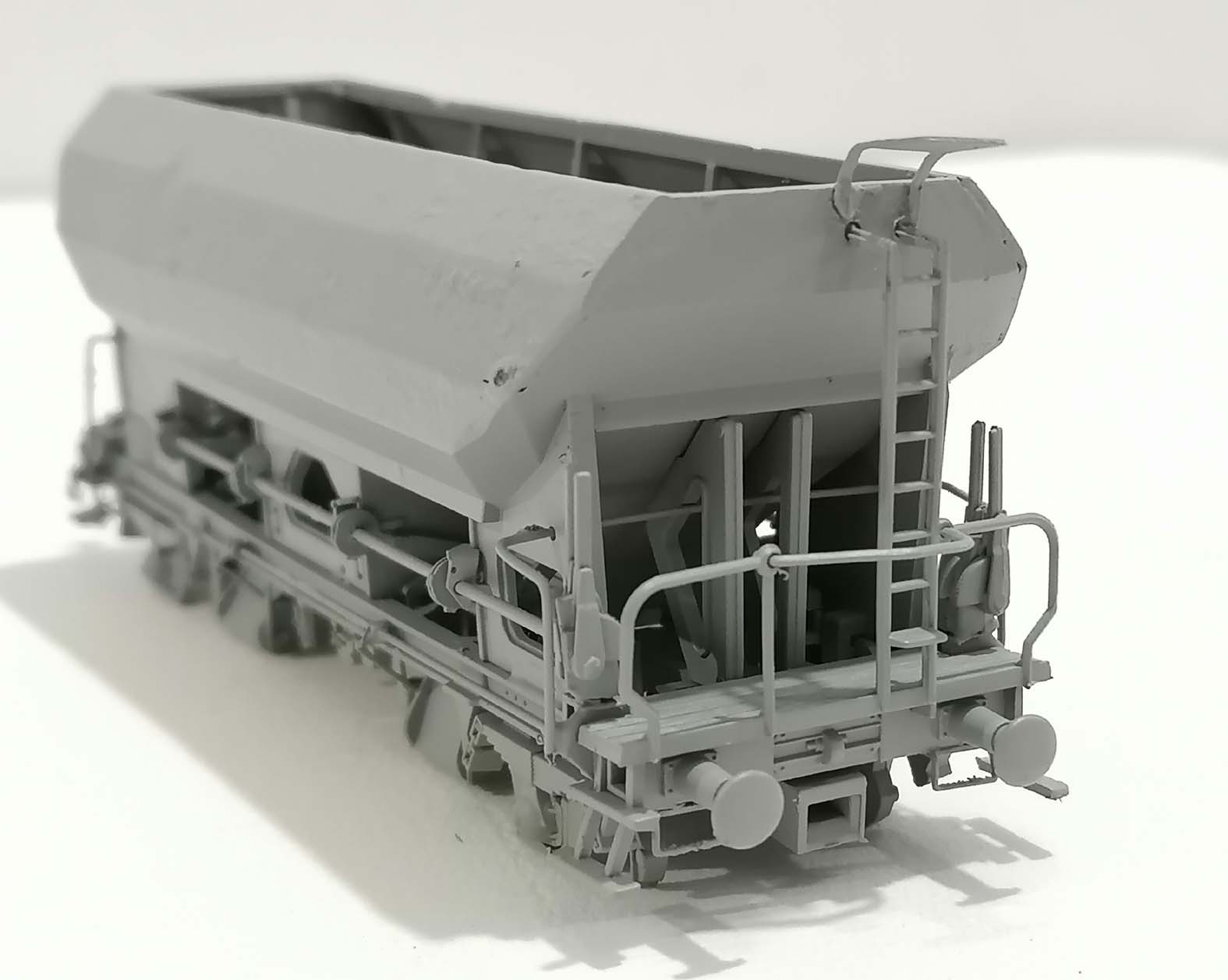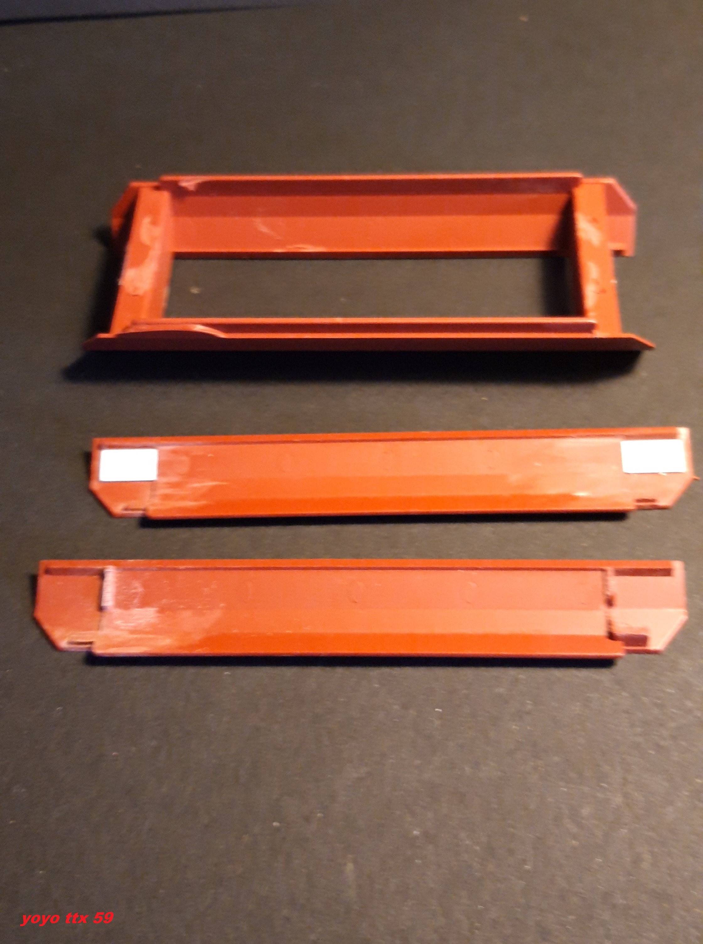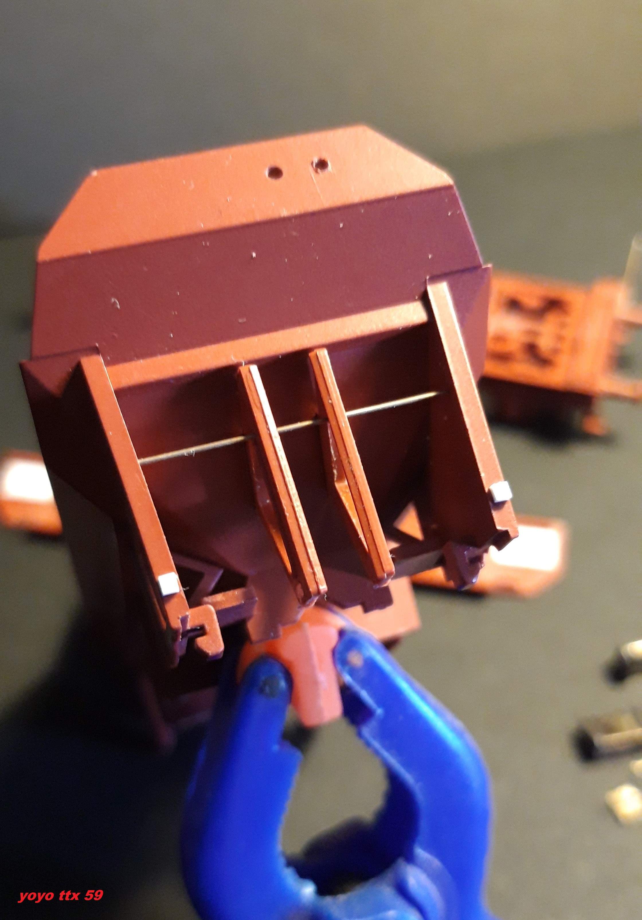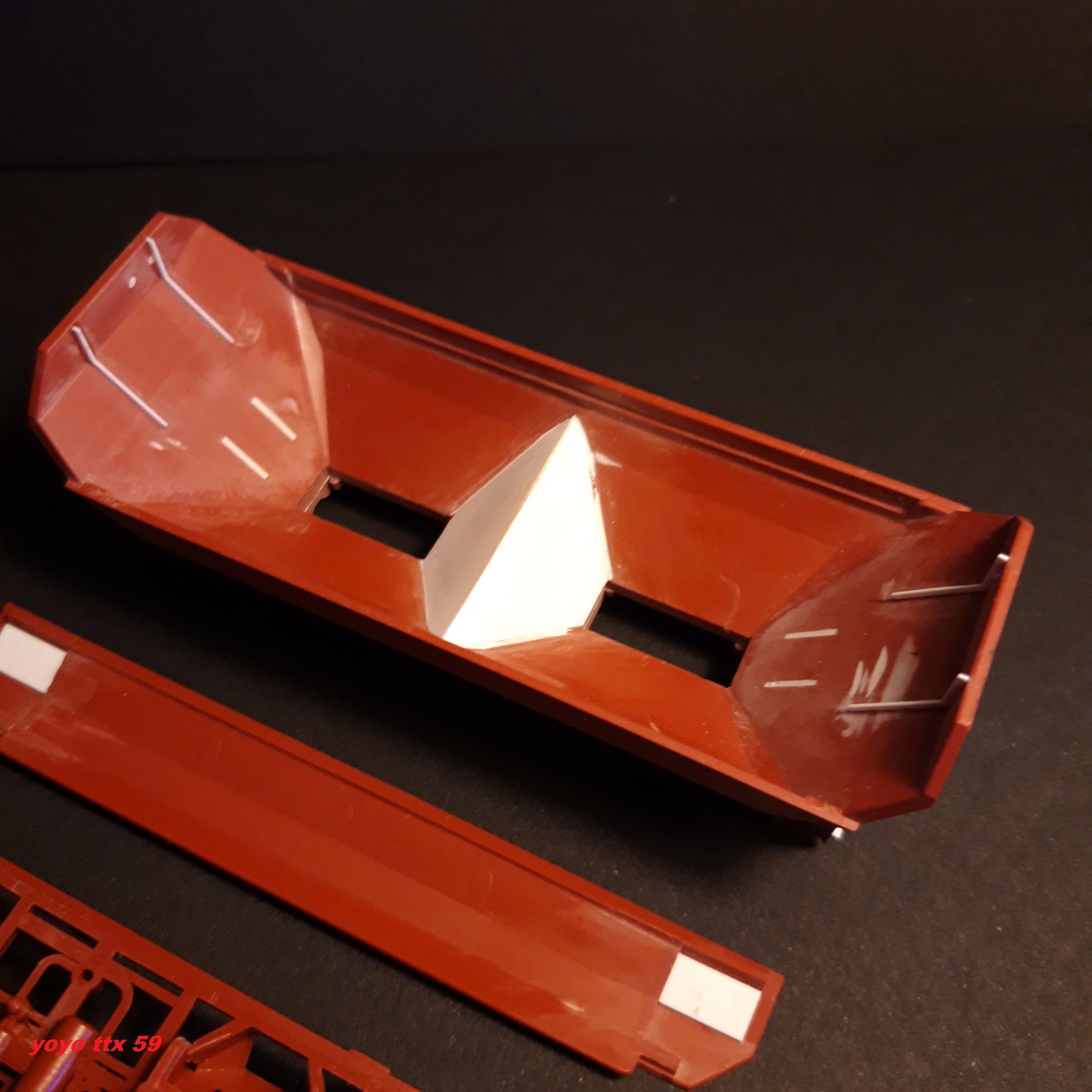 Je fais des patines et je voudrais faire des trémies à essieux Uas sur la base de wagon roco V. J'ai bien vu que le modèle roco n'est pas tout à fait conforme (2 échelles, rambardes fausses, ...) mais surtout il est rempli de ballast à ras bord.