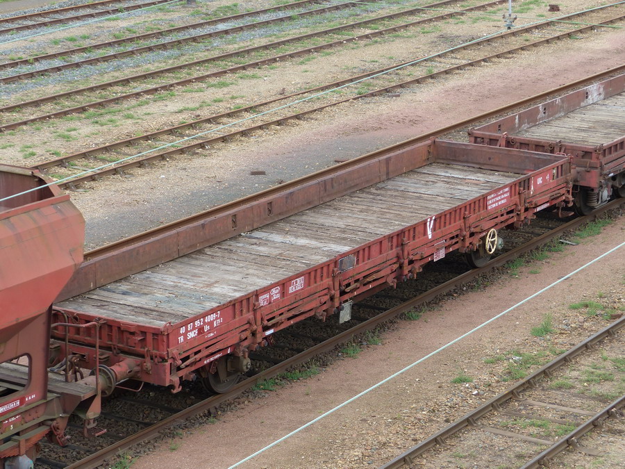 Voici le wagon plat à essieux 40 87 952 4 009-7 Us K25 2 - SNCF-TR - Infra V sur les voies de garage des rames INFRA/SNCF de