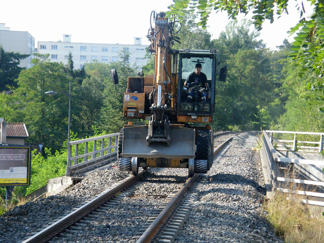 Ce matin, pelle RR de la Ste Champenoise de TP et voies férrées à 69 Champagne au Mont d'Or, au travail, sur le pont de l'Etoile d'Alaï, sur la ligne Tassin (69) à Brignais (69) ex ligne Tassin - Givors