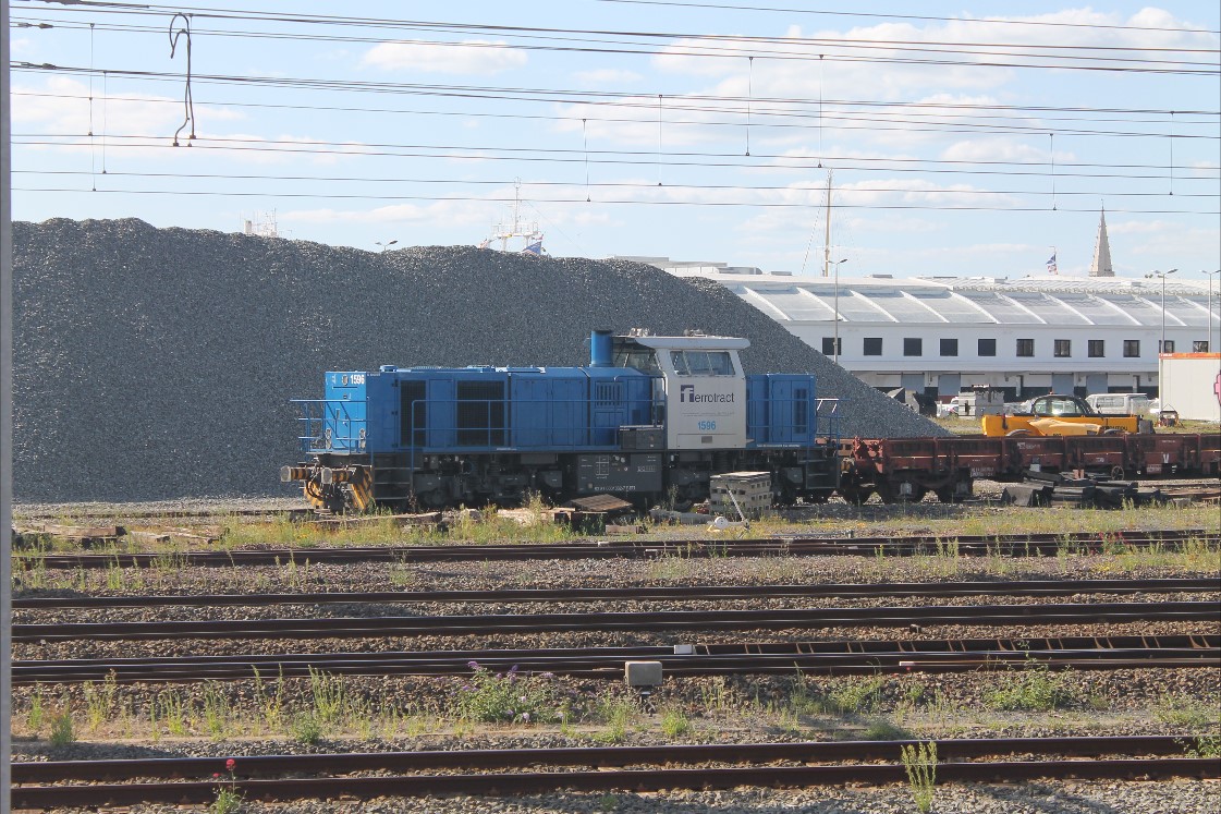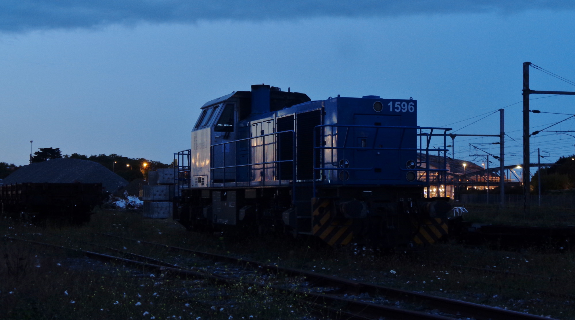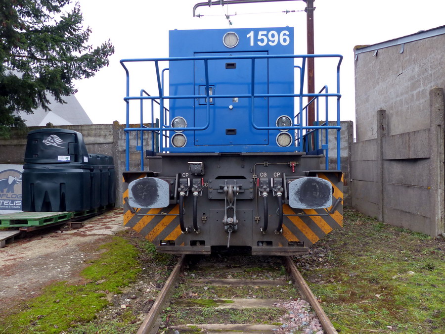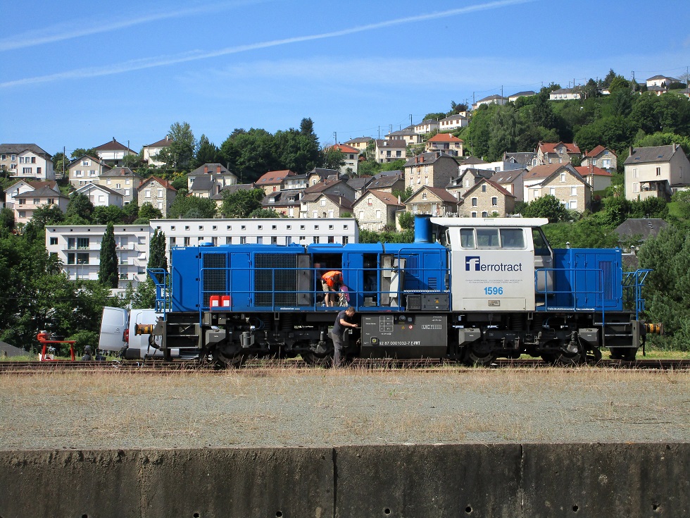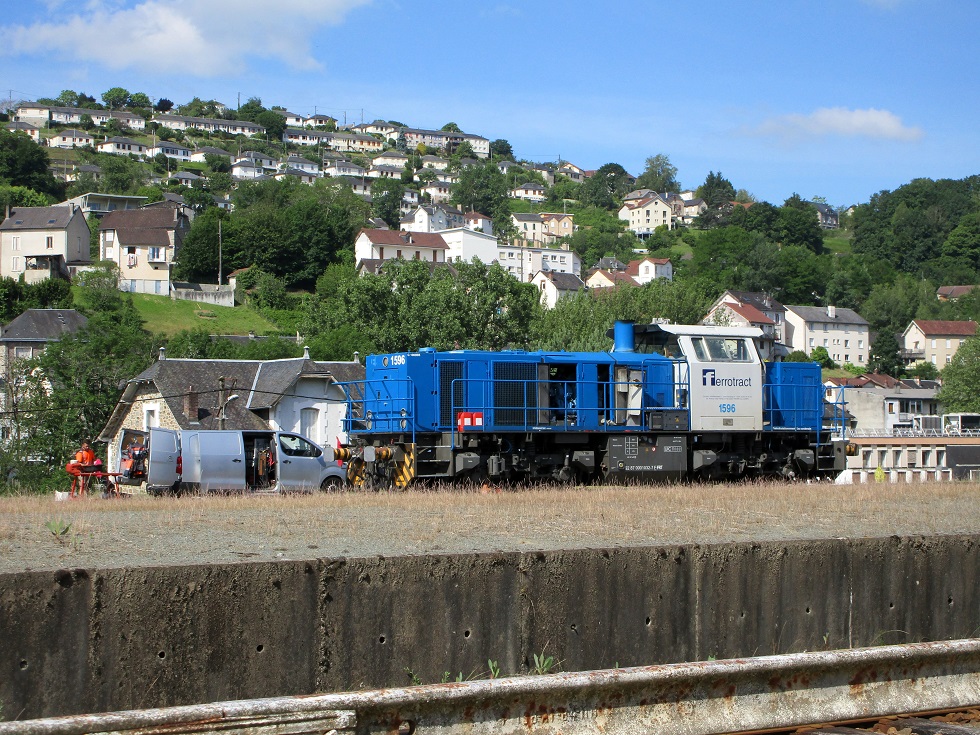 Ce jeudi 3 juin 2021 en fin de matinée, la machine 1596 en livrée bleue et cabine blanche (n° 92 87 0 001 032 7) était sur le faisceau de Tulle (Corrèze) attelée sur une rame de wagons Uas (plats à bogies) chargés de longs rails.