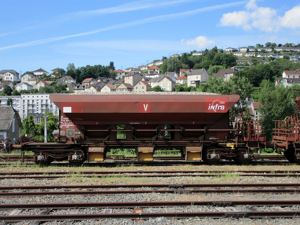 Alors qu'un peu plus loin sur la même voie au milieu de faisceau se trouvent 2 wagons trémie à bogies chargés de ballast :