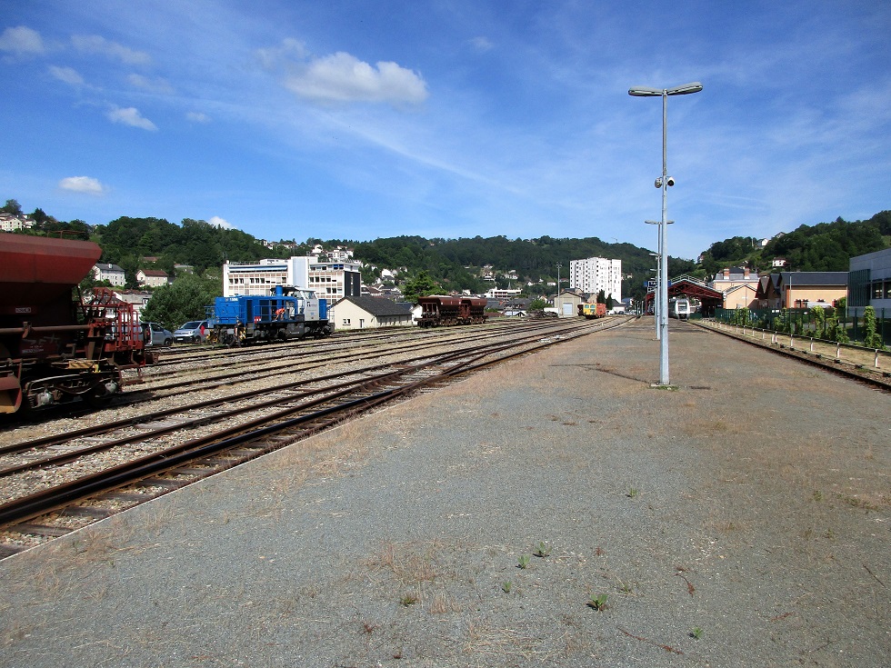 Retour en gare de Tulle hier mercredi 9 Juin 2021. Des indices visibles laissent penser à une activité de travaux en ligne : une G 10000 Vossloh Ferrotract, la rame de trémie de ballast vide et la rame de longs rails ont quitté le faisceau depuis la semaine dernière. La position de la bourreuse et des wagons trémie chargés de ballast sur les voies ainsi que la composition de cette rame diffère de leurs emplacements respectifs de la semaine passée.