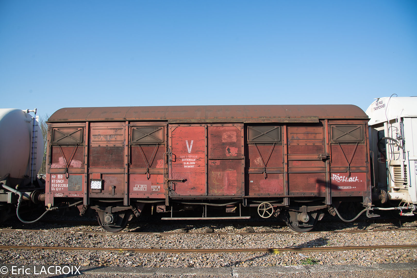 Voici le wagon 40 87 959 0 220-9 Us G54 4 SNCF-RO - gare d'attache Sotteville SL N-DEB Brimont avec la voiture de cantonnement