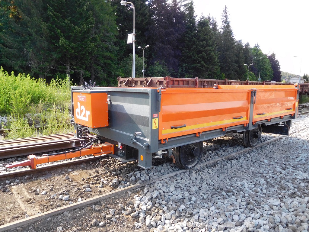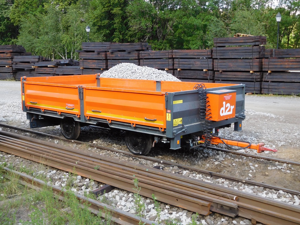 Petite remorque D2R vue en gare de La bastide - Puylaurent avec la pelle D2R ZX 170 PRR de la société EDC Terrassement.