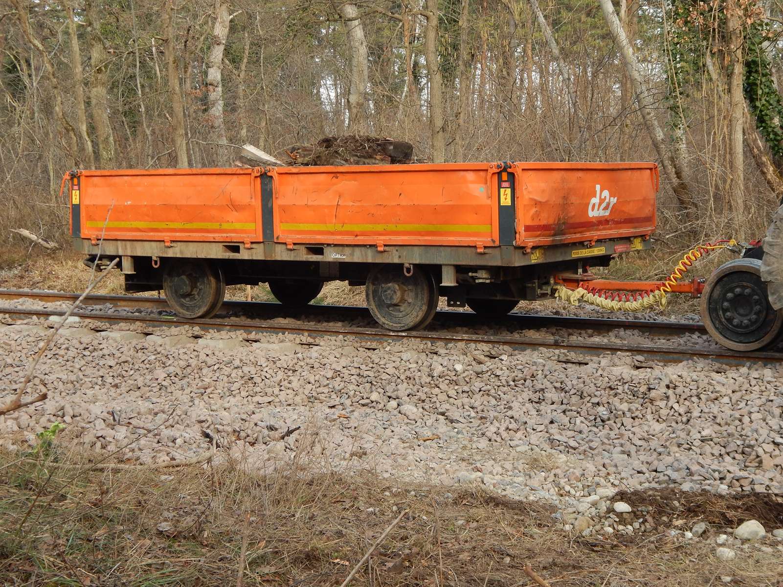 une remorque D2R qui accompagne la pelle C258 sur la ligne Volgelsheim-Marckolsheim le 07/02/2025.