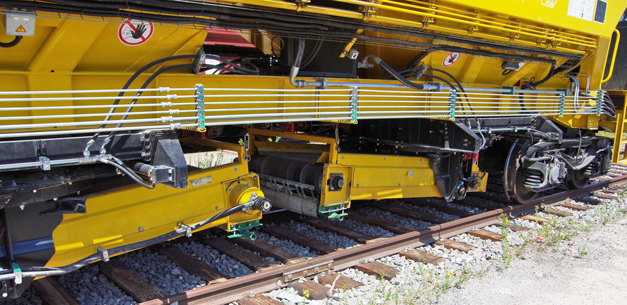 avec deux trémies et possibilité de ballastage, et aussi pour récupérer l'ancien ballast et qui le vide avec les bandes transporteuses